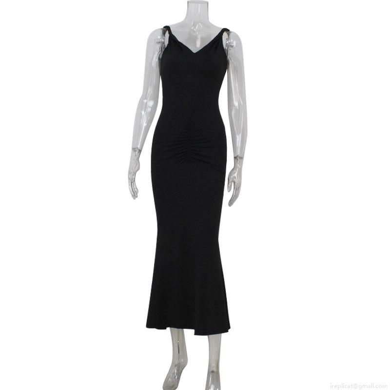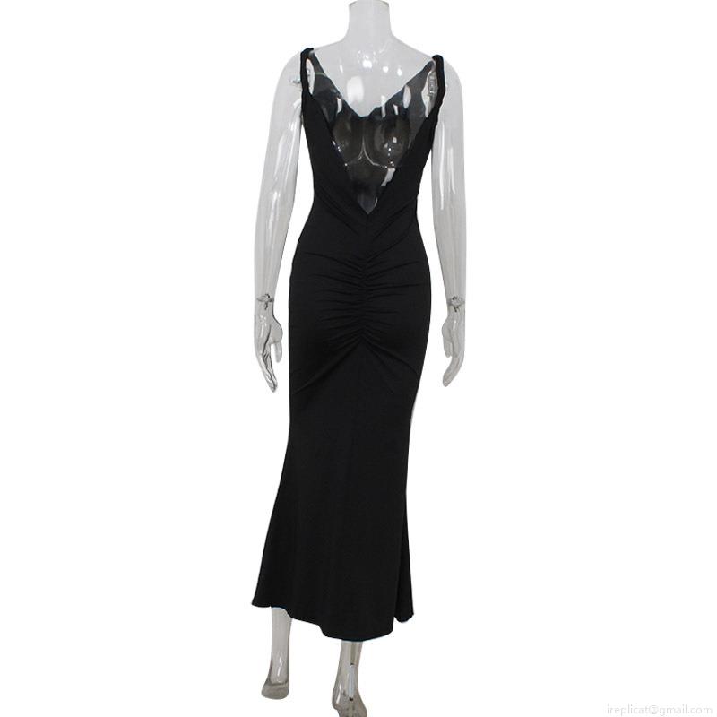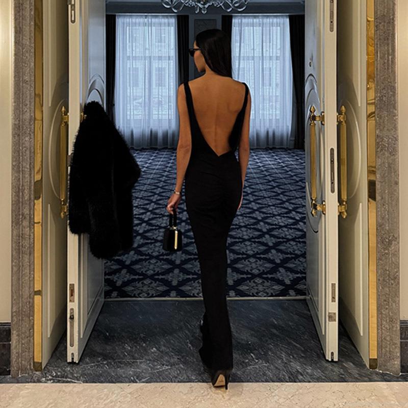 • Sexy Backless V Neck Maxi Dress Elegant Bodycon Mermaid Evening Gown For Women Sleeveless Ruched Party Clubwear Solid Color Slim Fit Long Dress