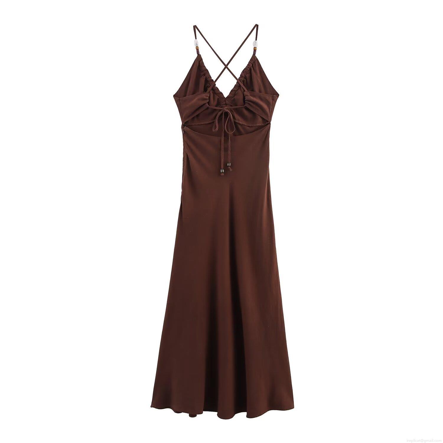 • Sexy Backless V Neck Spaghetti Strap Maxi Dress With Bead Detail Summer Bohemian Solid Color Tie Up A-Line Linen Blend Party Long Dress For Women