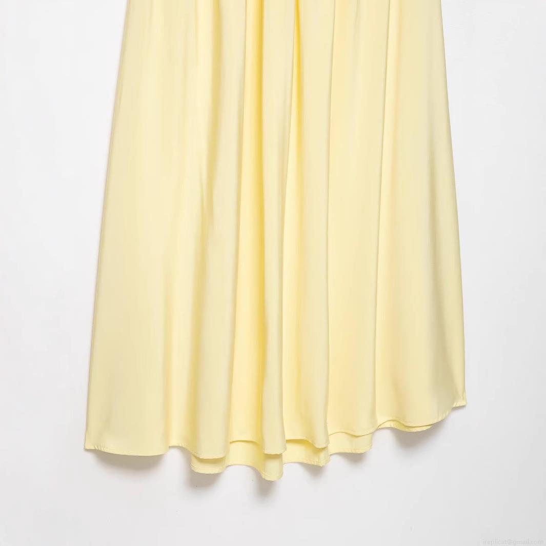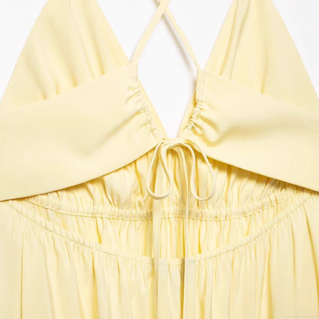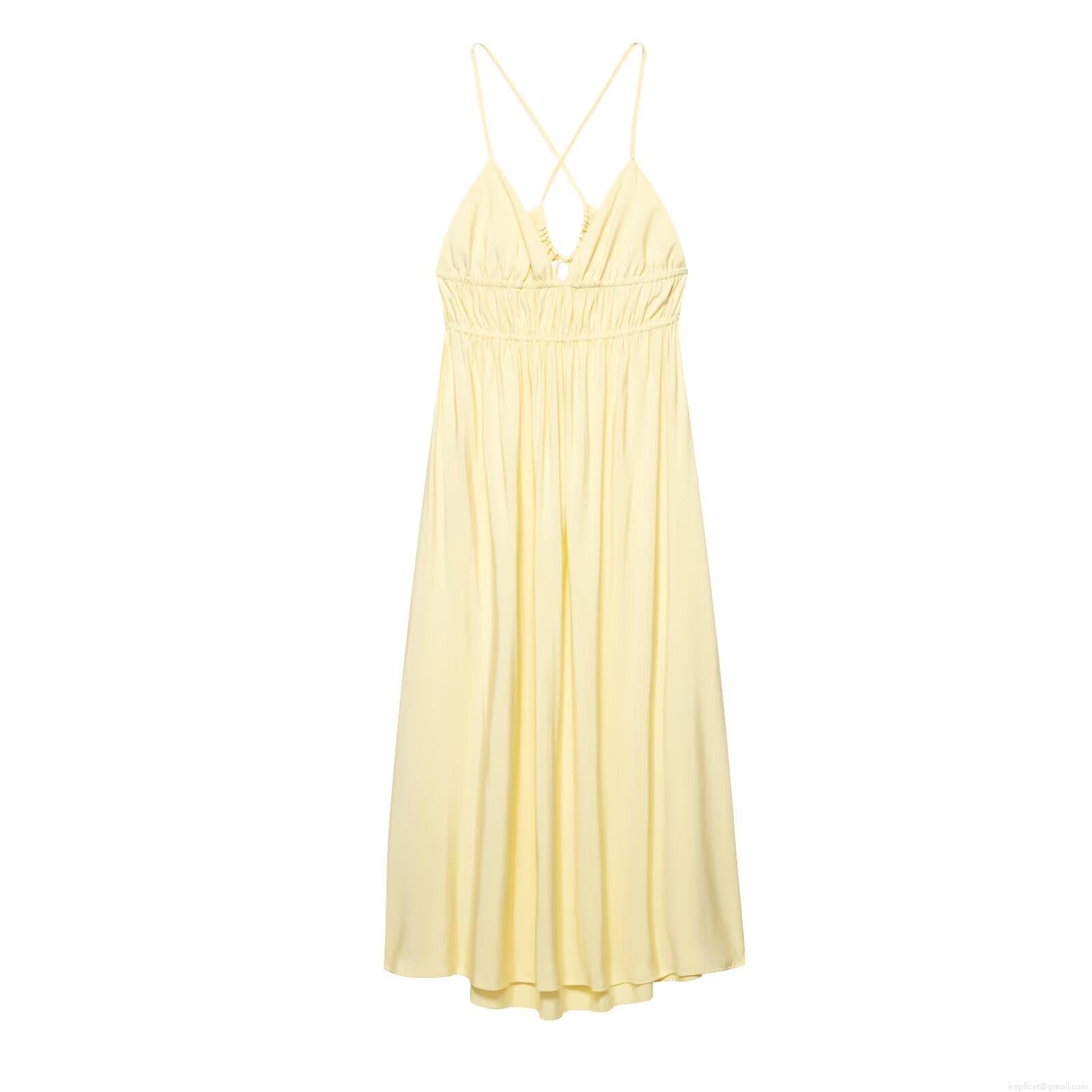 • Sexy Backless V-Neck Ruched Cami Dress Women Summer Polyester Cross Strap Maxi Dress Light Yellow Streetwear Party Club Outfits