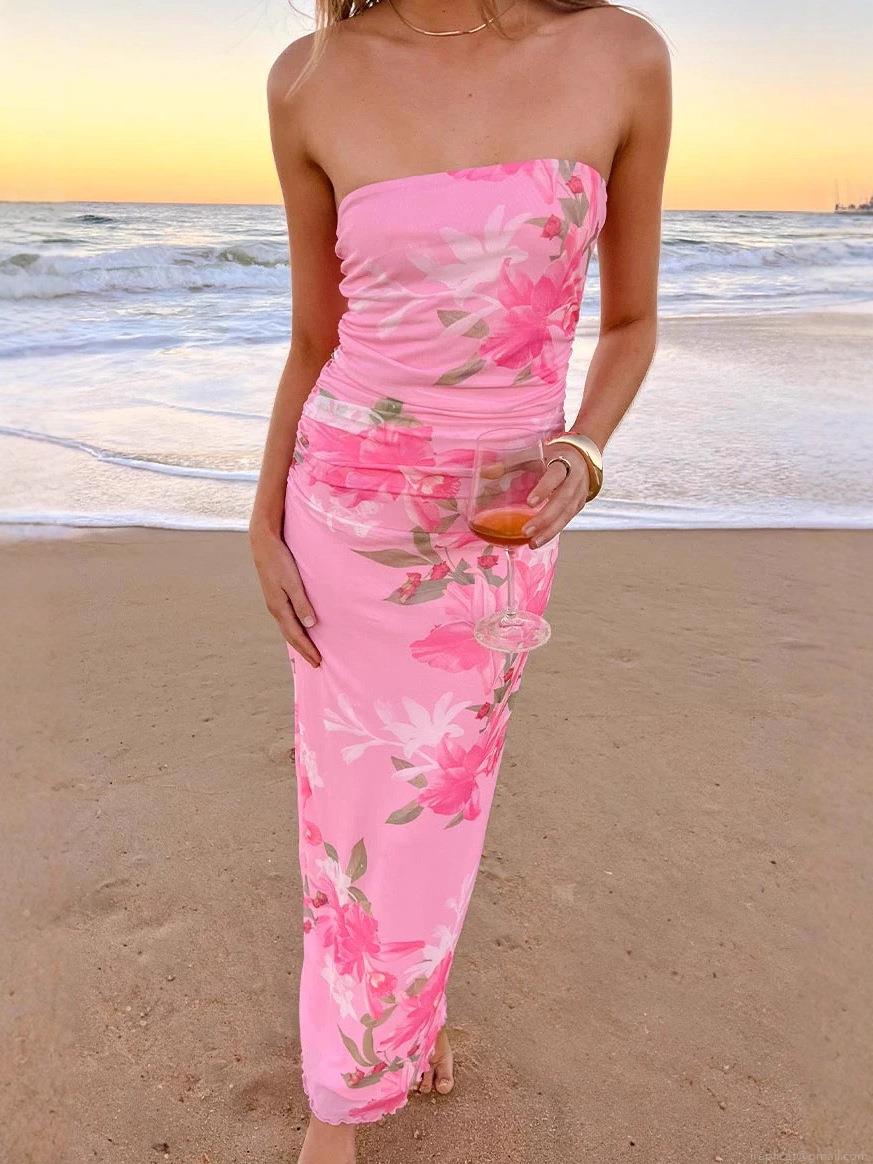 • Sexy Bandeau Maxi Dress Mesh Ruched Floral Print Slim Fit Bodycon Summer Beach Vacation Long Dress For Women