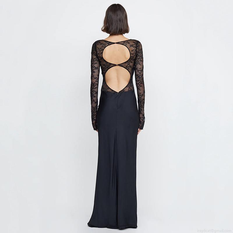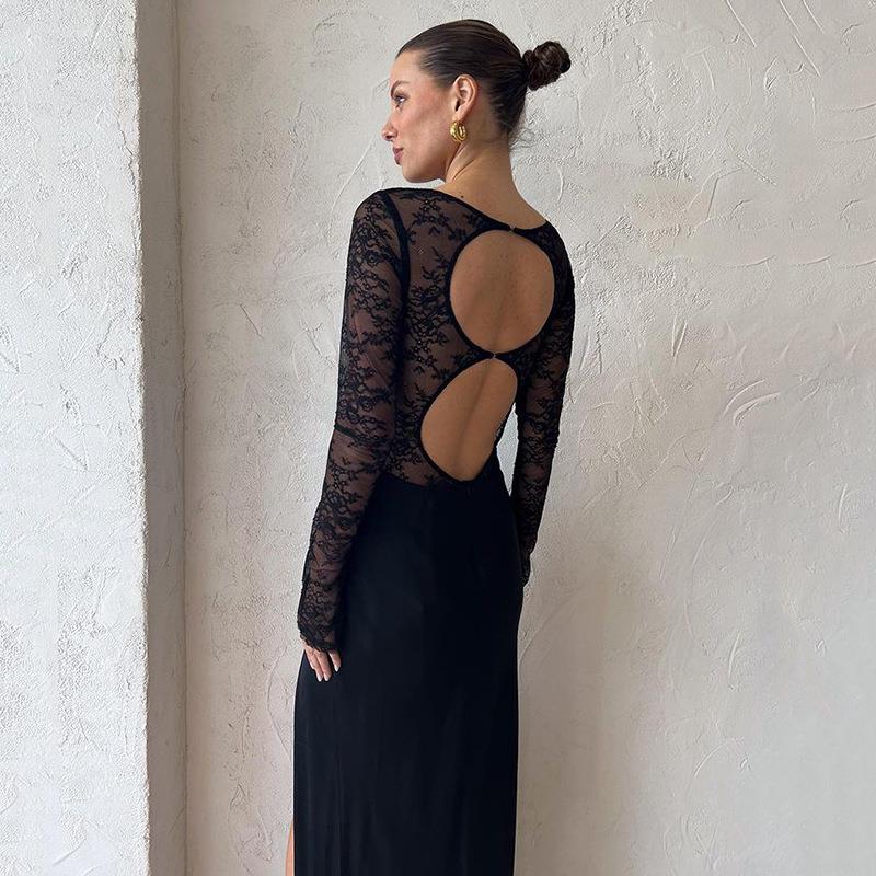 • Sexy Black Lace Patchwork Maxi Dress See-Through Backless High Split Long Sleeve Satin Gown For Women Evening Party Club Wear