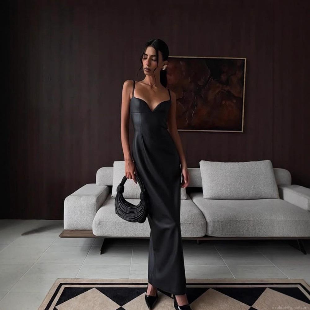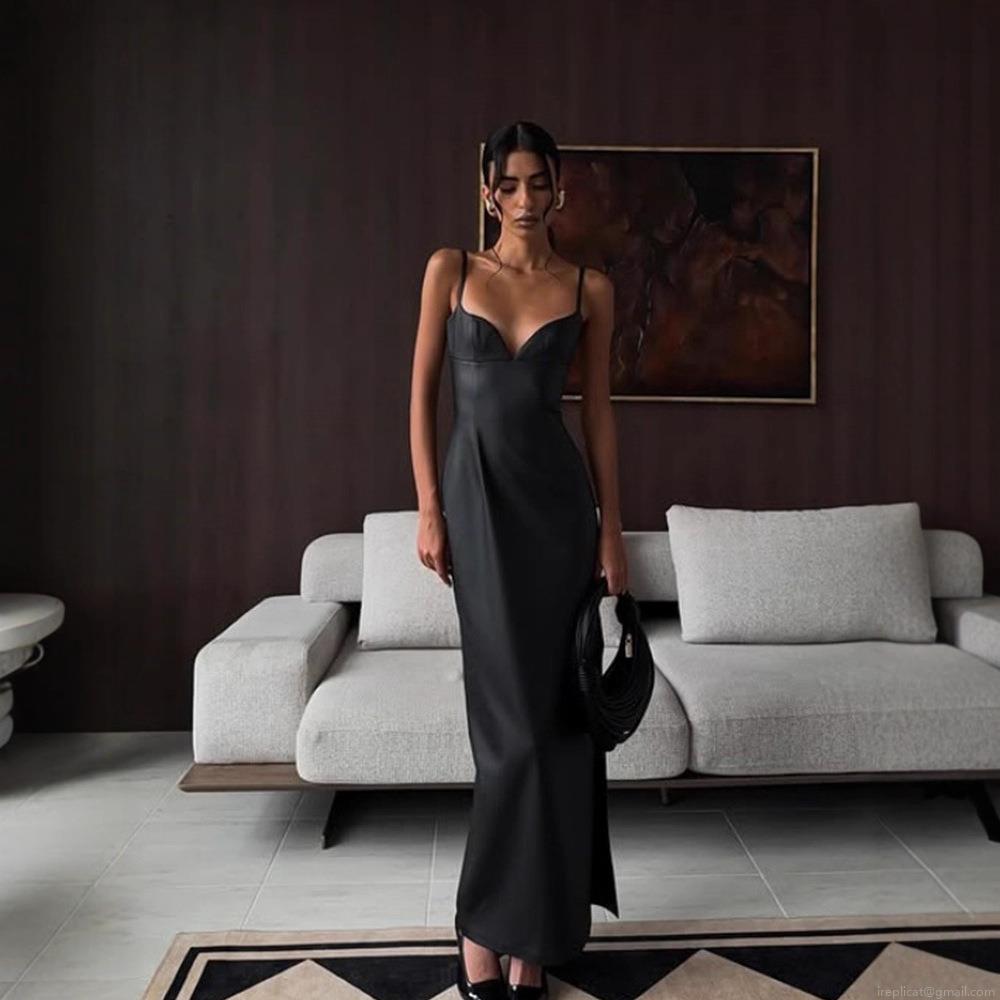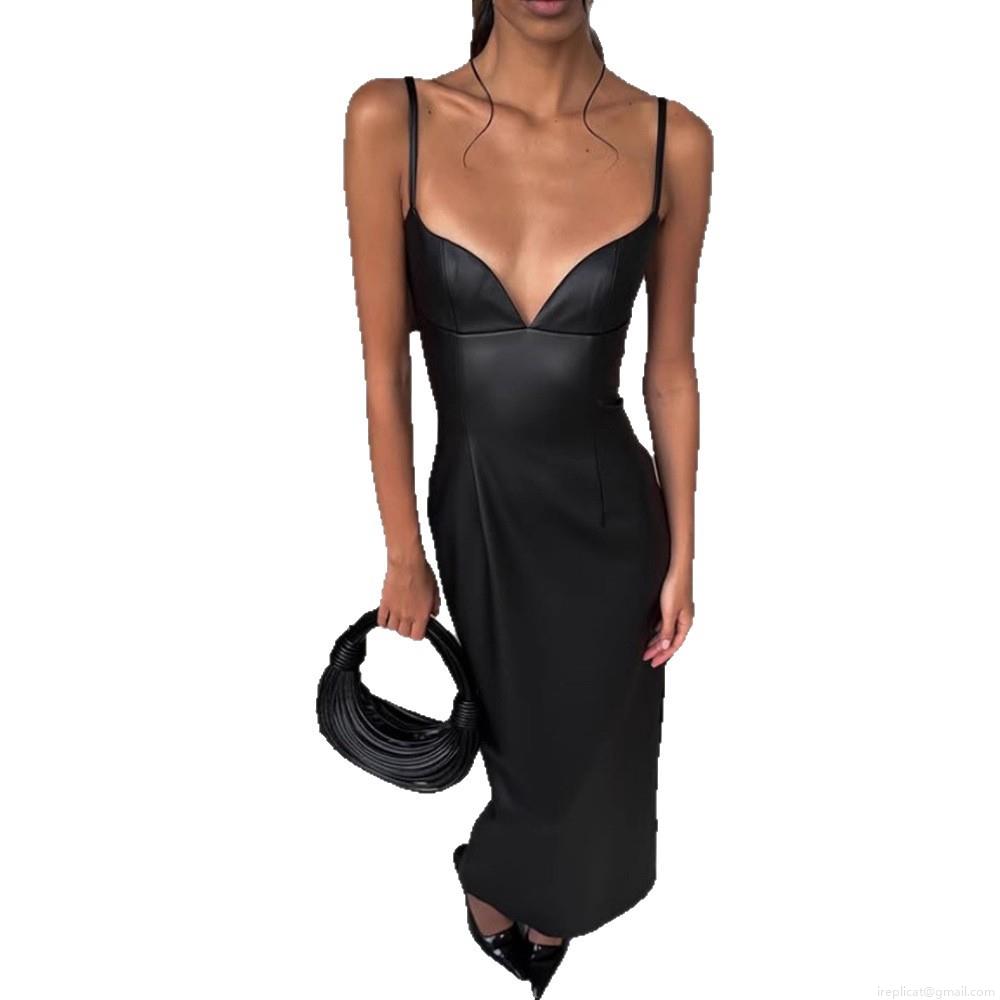 Solid Color, Pu Leather, Thin Shoulder Straps, Deep V-neck, Slit Design