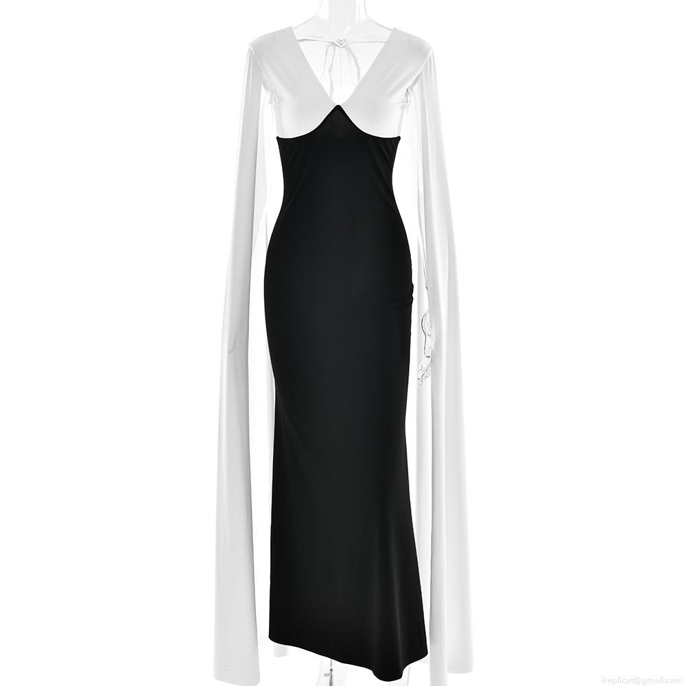 Sexy Black White Patchwork Maxi Dress Elegant V Neck Backless Cape Sleeve Bodycon Evening Gown Polyester Slim Fit Long Dress For Women Party Banquet
