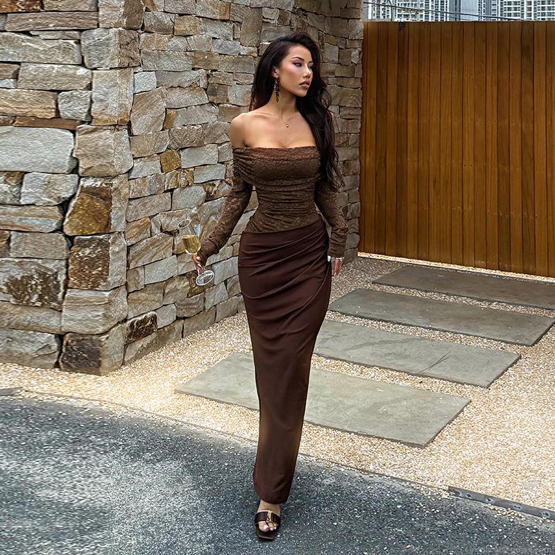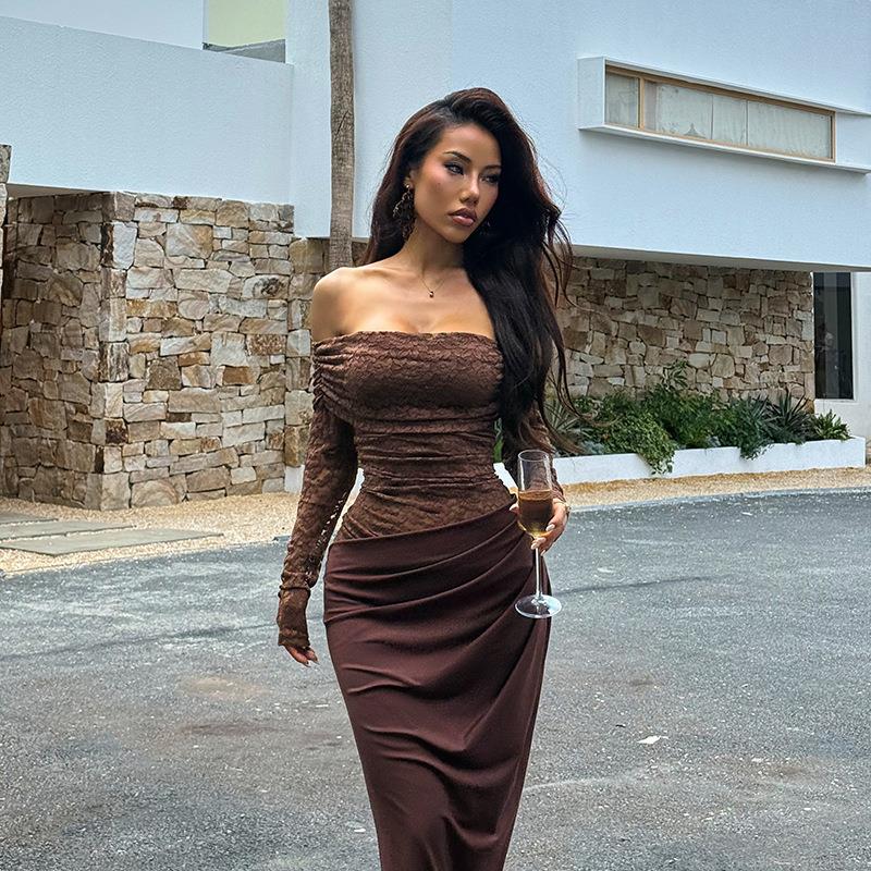 • Sexy Brown Off-Shoulder Lace Patchwork Maxi Dress Elegant Slim Fit Bodycon Long Evening Party Dress For Women Streetwear Style
