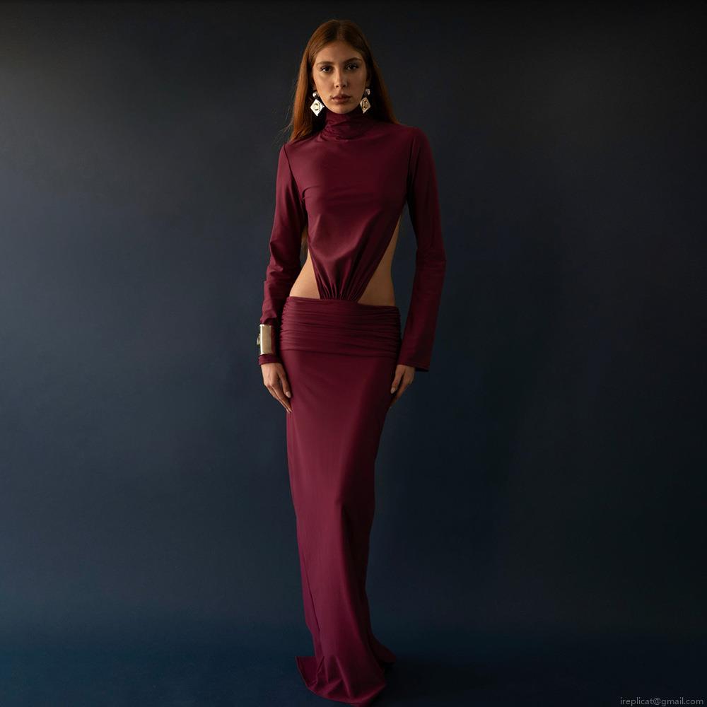 Sexy Cut-out Maxi Dress Women Long Sleeve Mock Neck Milk Silk Patchwork Ruched Backless Bodycon Slim Long Dress For Party Streetwear