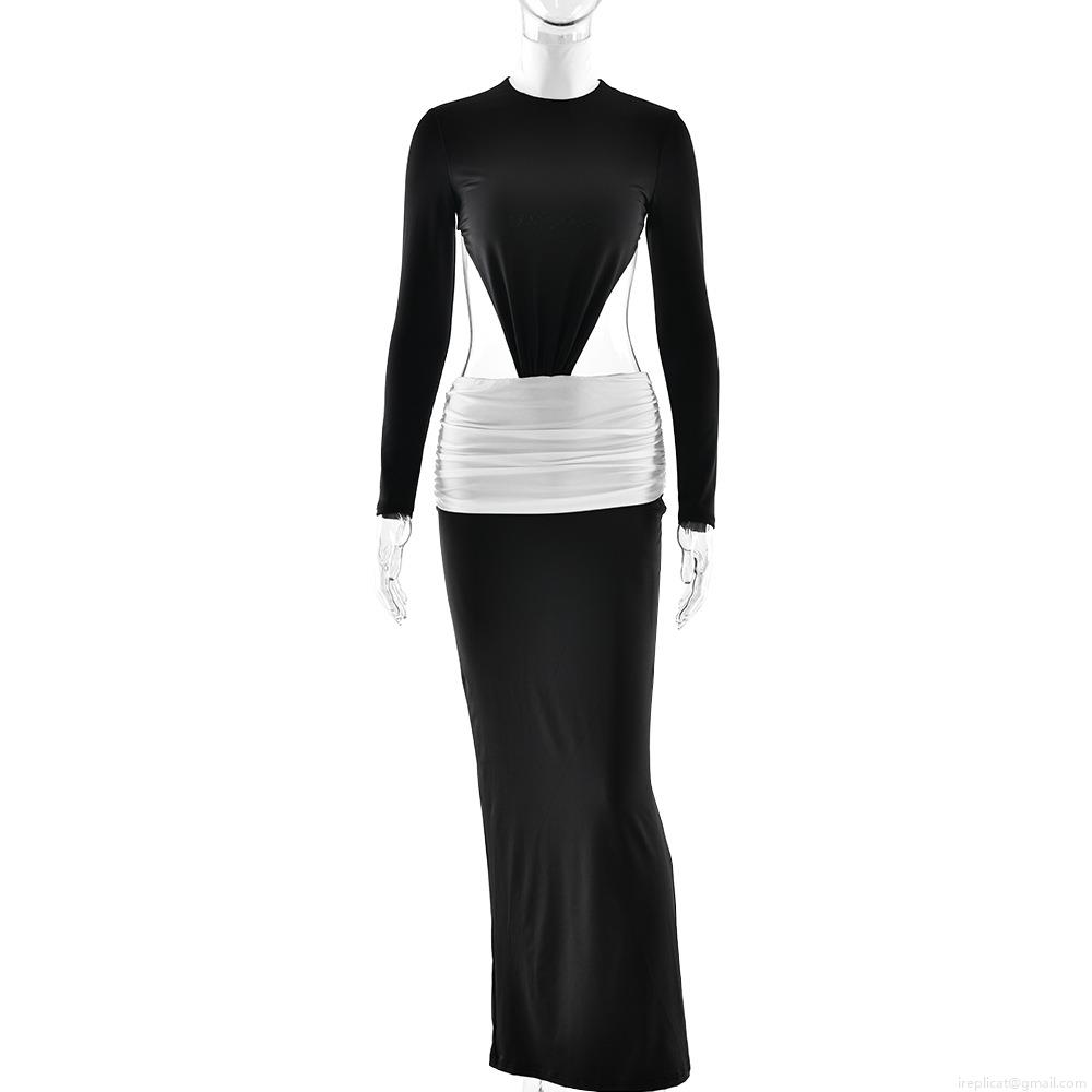 • Sexy Cut-out Maxi Dress Women Long Sleeve Mock Neck Milk Silk Patchwork Ruched Backless Bodycon Slim Long Dress For Party Streetwear