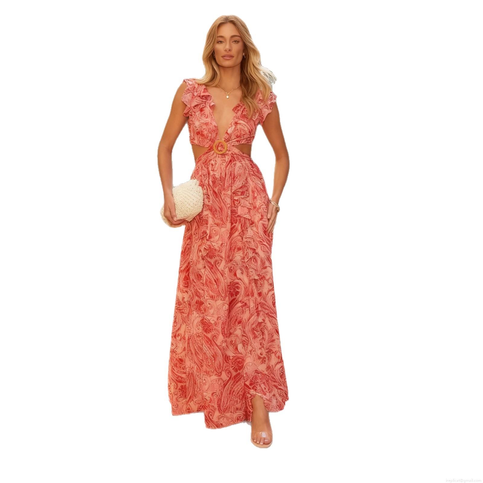 • Sexy Deep V Neck Cutout Maxi Dress Elegant Ruffle Sleeveless Backless Long Dress Bohemian Paisley Print Beach Vacation Dress For Women