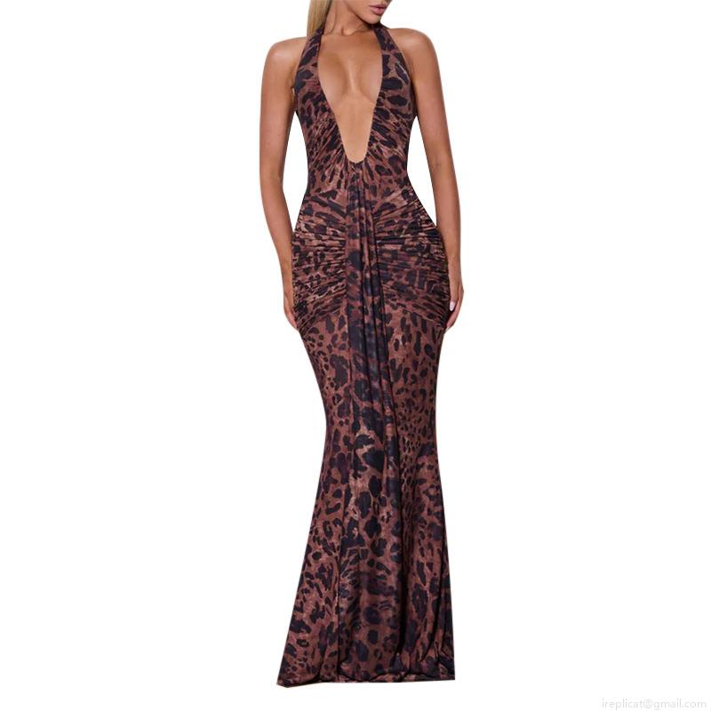 • Sexy Deep V Neck Halter Leopard Print Maxi Dress For Women Backless Ruched Bodycon Long Party Evening Dress Polyester Spandex Slim Fit