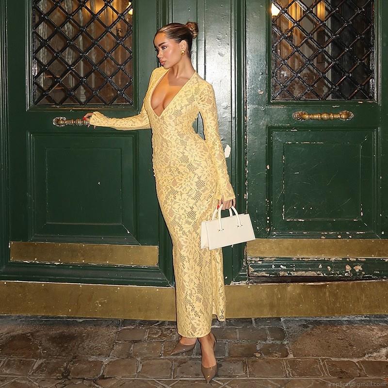 • Sexy Deep V Neck Lace Maxi Dress Long Sleeve Hollow Out Slim Fit Elegant Floor Length Evening Party Bodycon Dress For Women