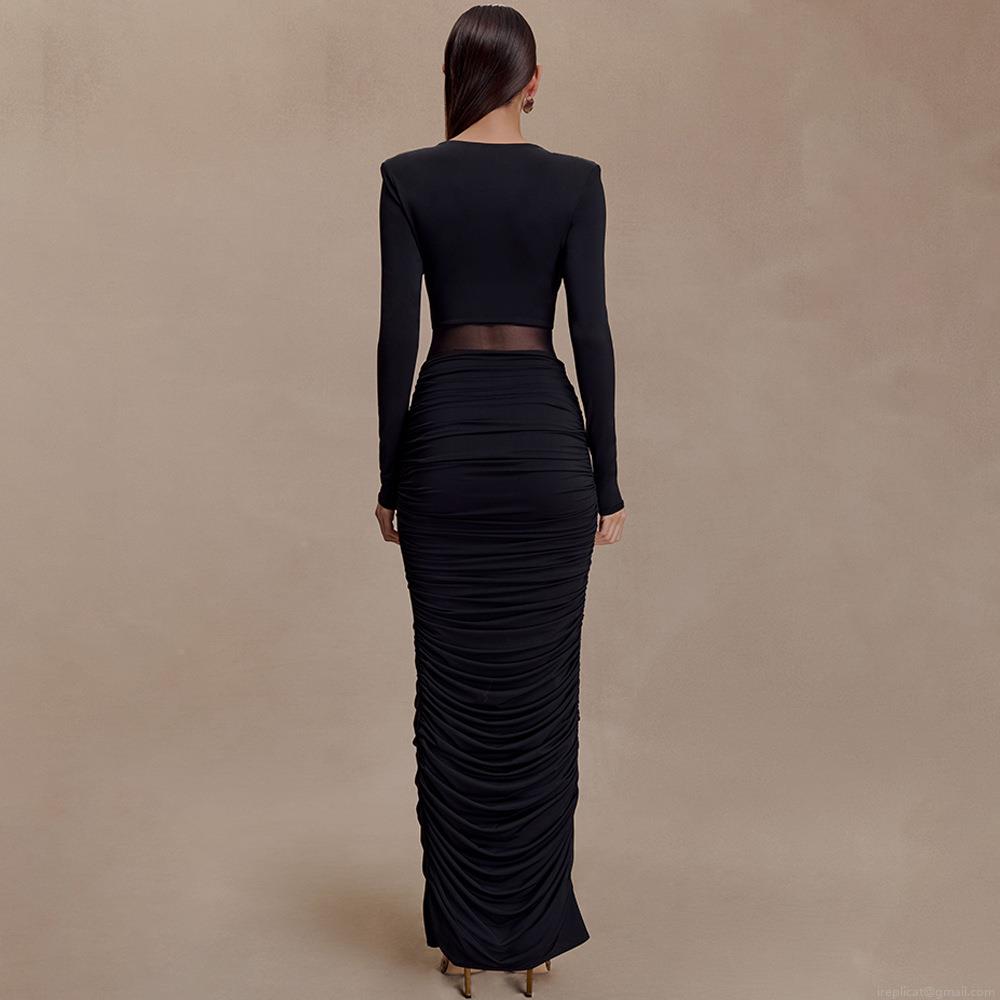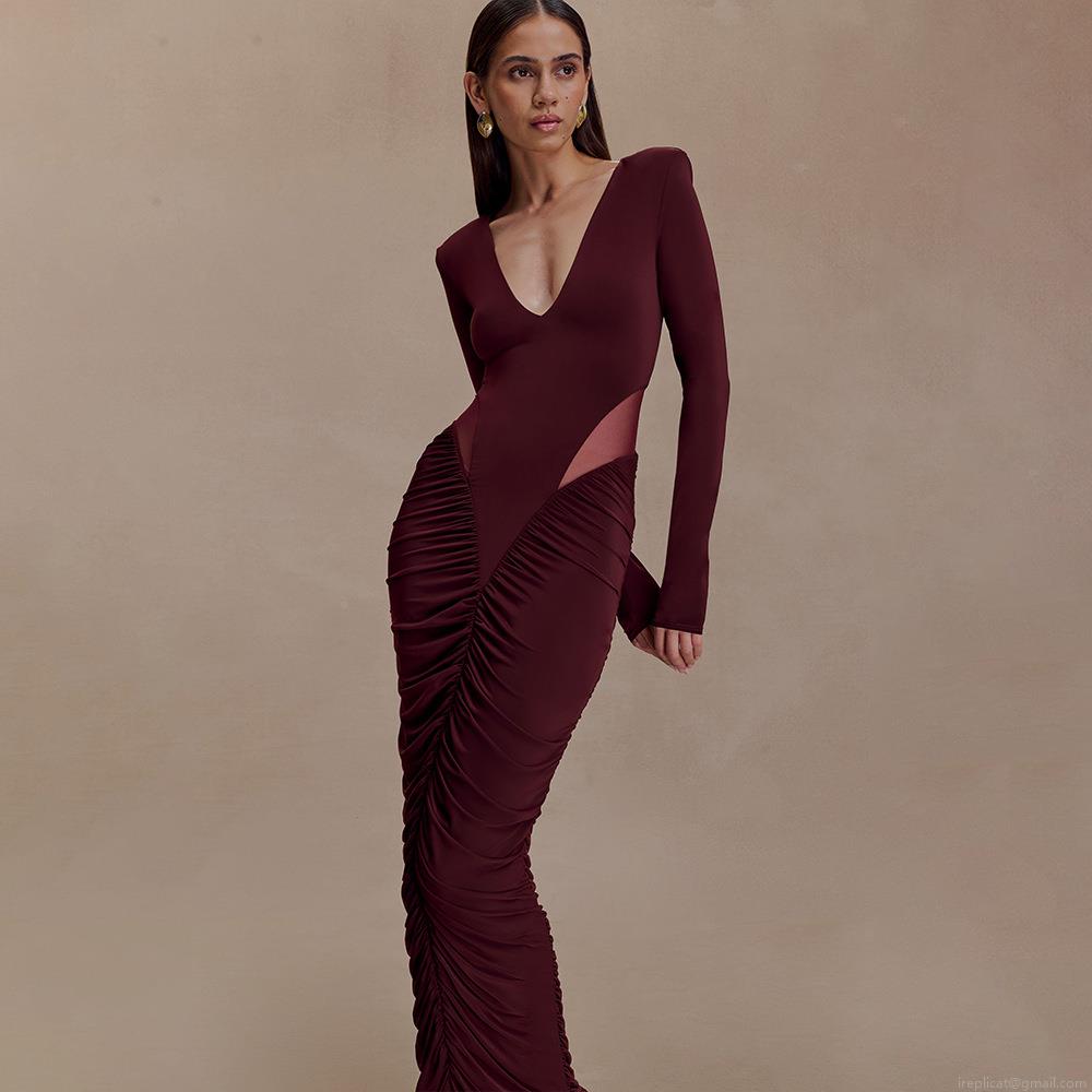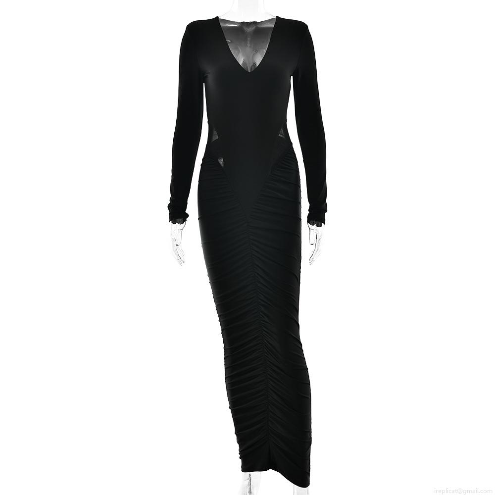Sexy Deep V Neck Ruched Bodycon Maxi Dress For Women Long Sleeve Mesh Patchwork Pleated Party Evening Club Slim Fit Floor Length Slinky Gown