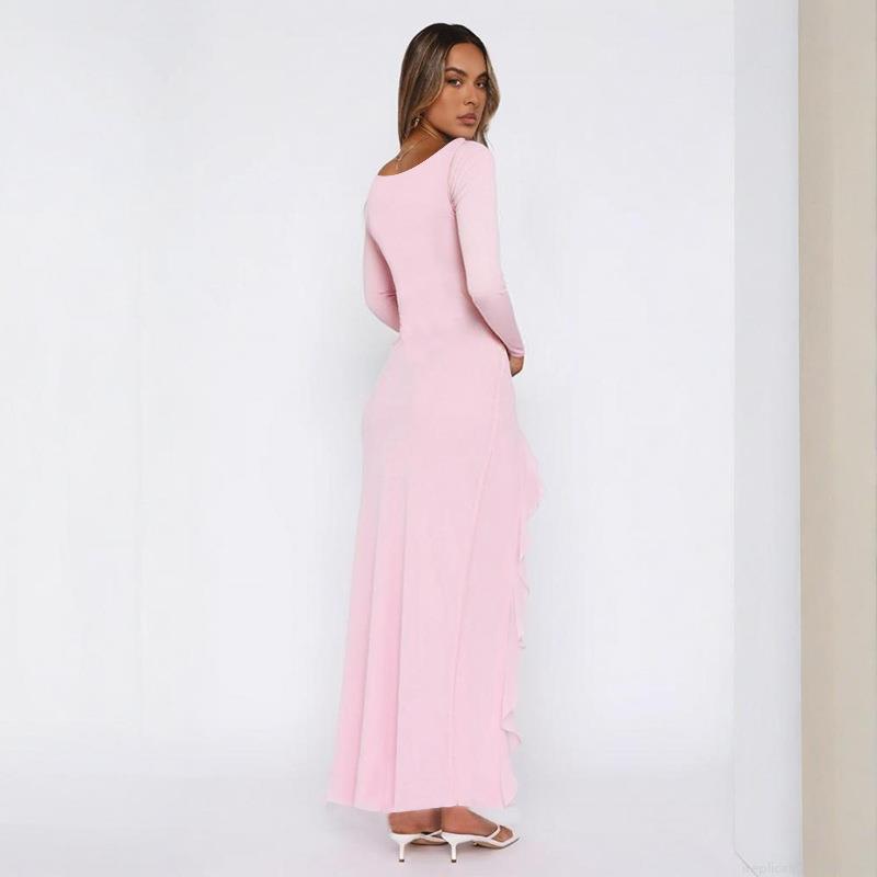 Sexy Deep V-Neck Long Sleeve Ruffle Slit Maxi Dress For Women 2025 New Hot Girl Style Slim Fit Polyester Long Party Dresses For Evening Clubwear