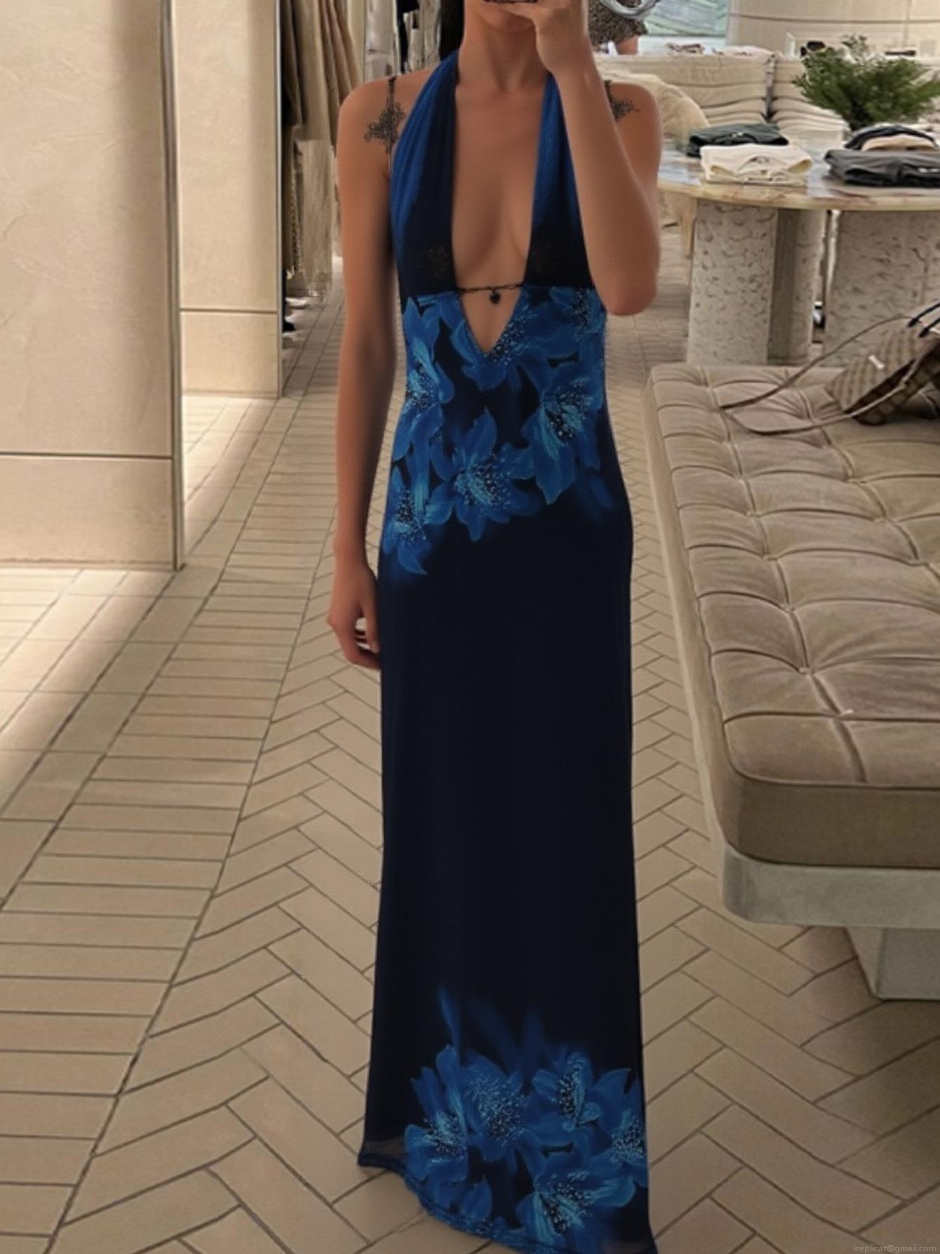 • Sexy Floral Print Halter Backless Maxi Dress For Women Deep V Neck High Split Bodycon Evening Party Dress Summer Sleeveless Clubwear Long Dress