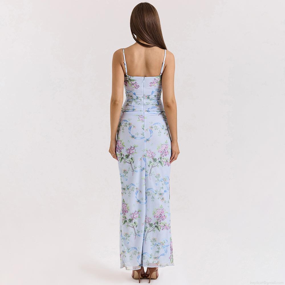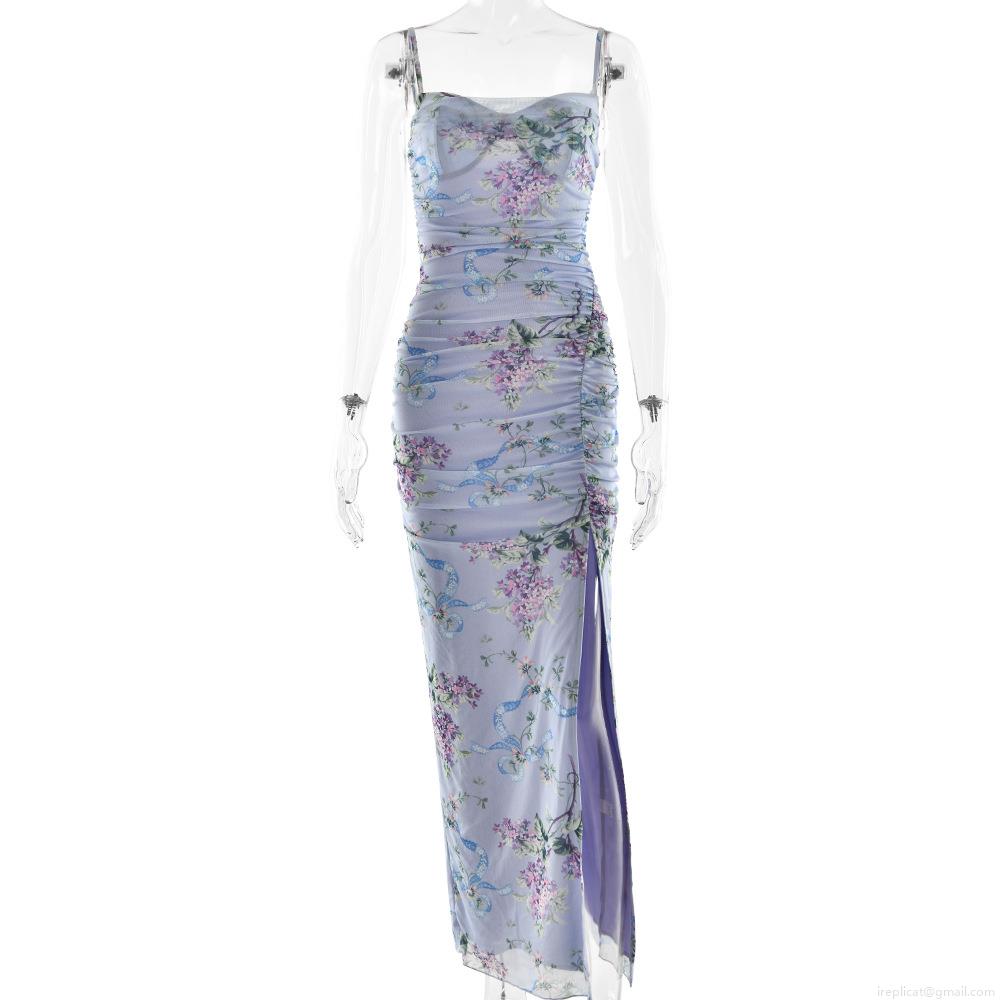 • Sexy Floral Print Mesh Maxi Dress Backless Spaghetti Strap Ruched High Split Bodycon Dress For Women Summer Party Evening Nightclub Wear