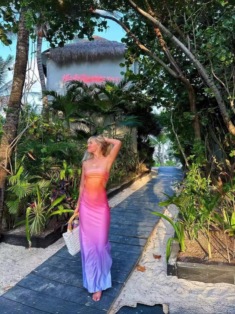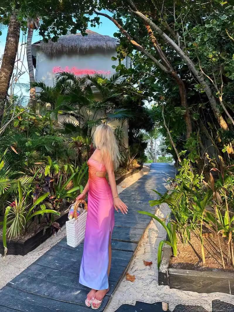• Sexy Gradient Bandeau Maxi Dress With Polyester Elastane Milk Silk Fabric Hollow Out Waist Side Slit Vacation Beach Bodycon Long Dress For Women