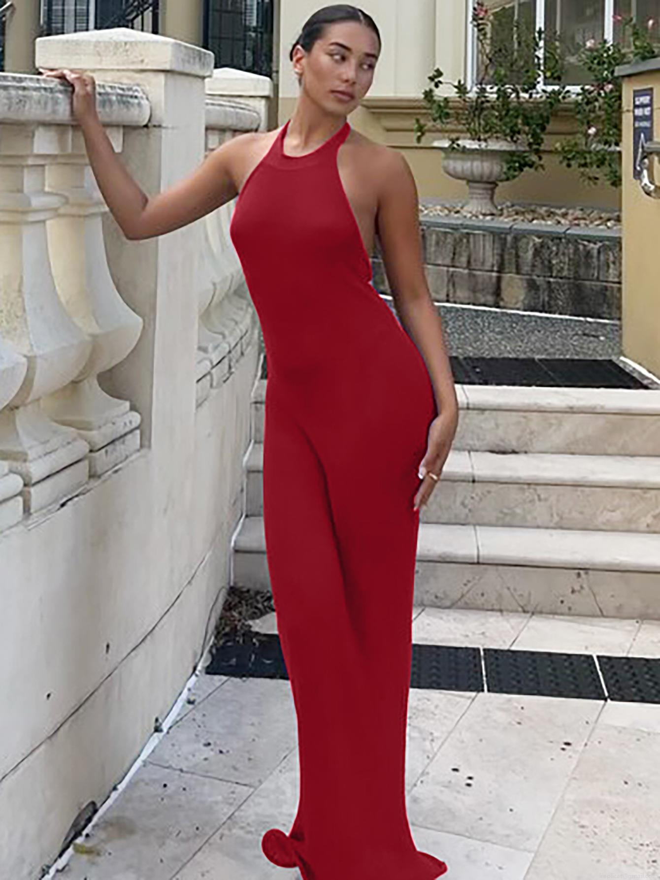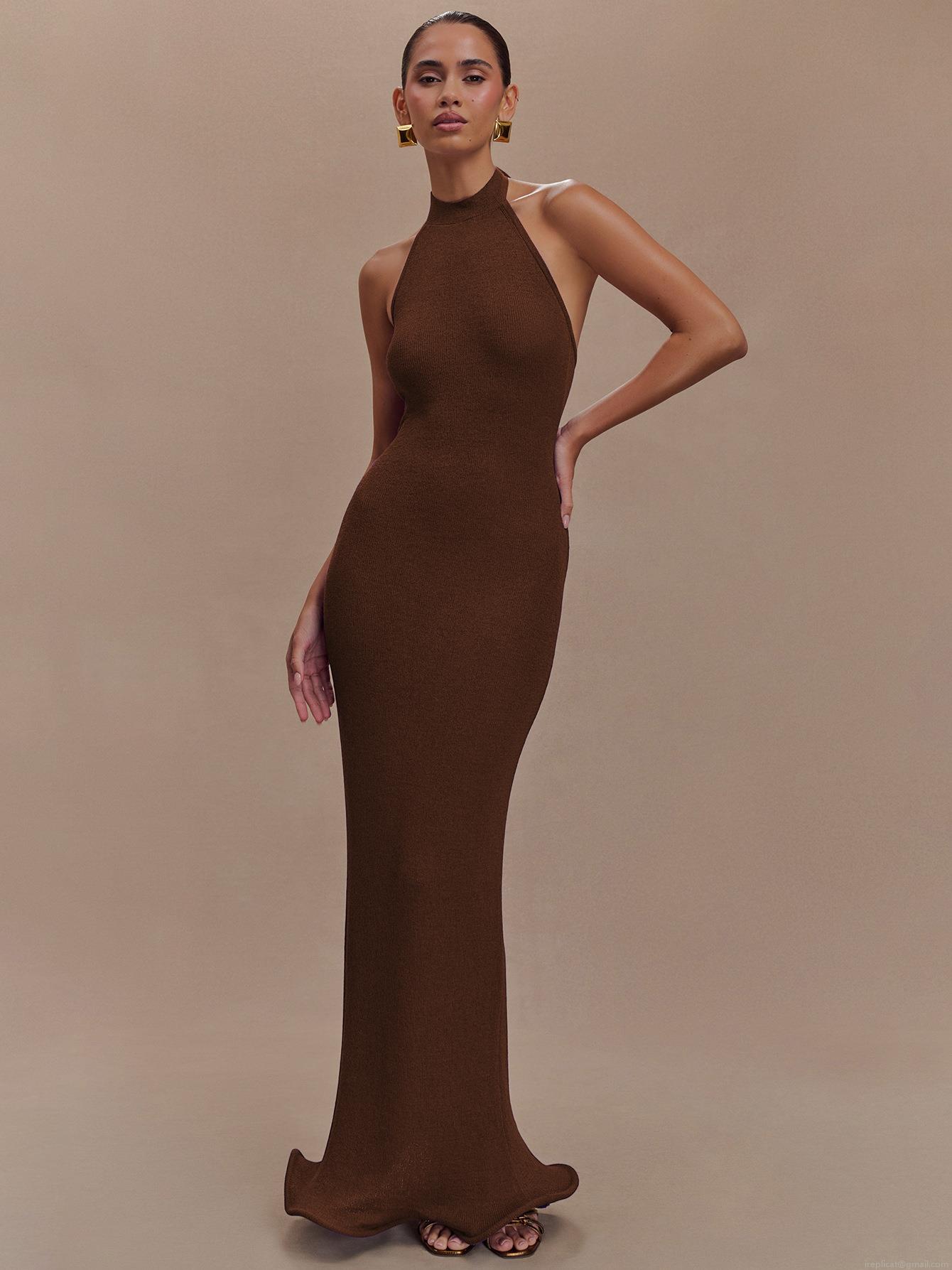 • Sexy Halter Backless Bodycon Maxi Dress For Women Summer Elegant Knit Polyester Spandex Long Dress For Party Club Night