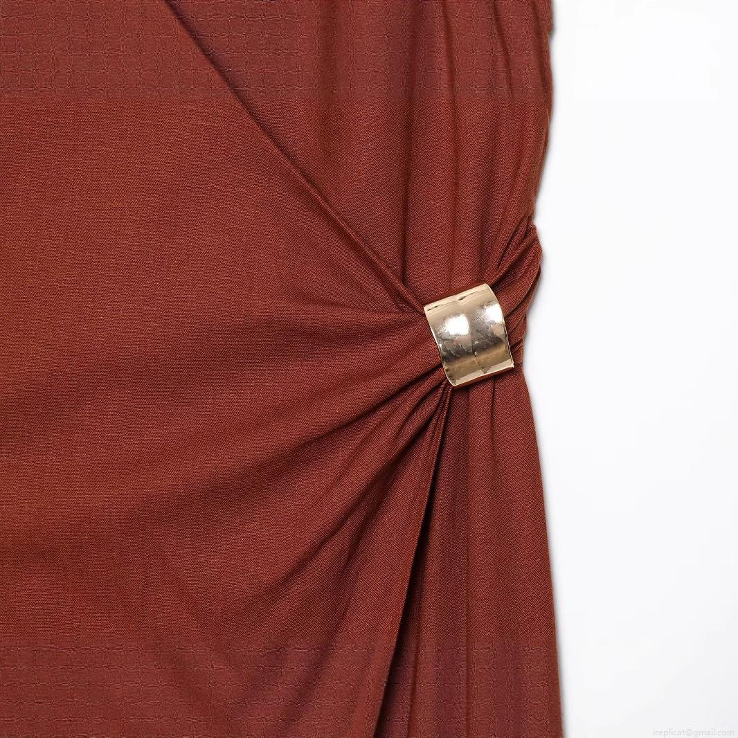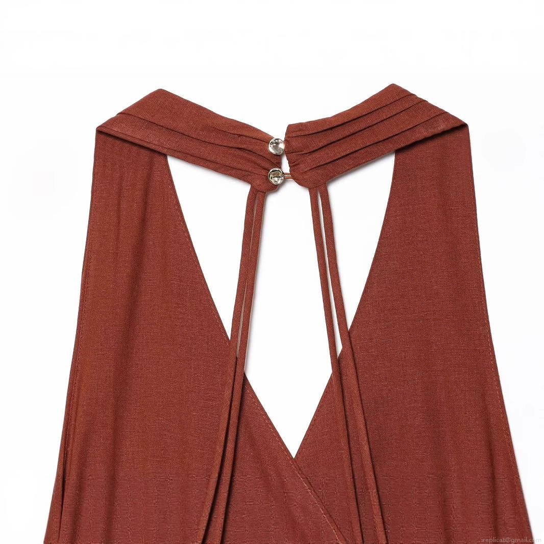 Solid Color, Pleats, Neckband, V-neck, Backless, High Fork, Metal Ring Decoration