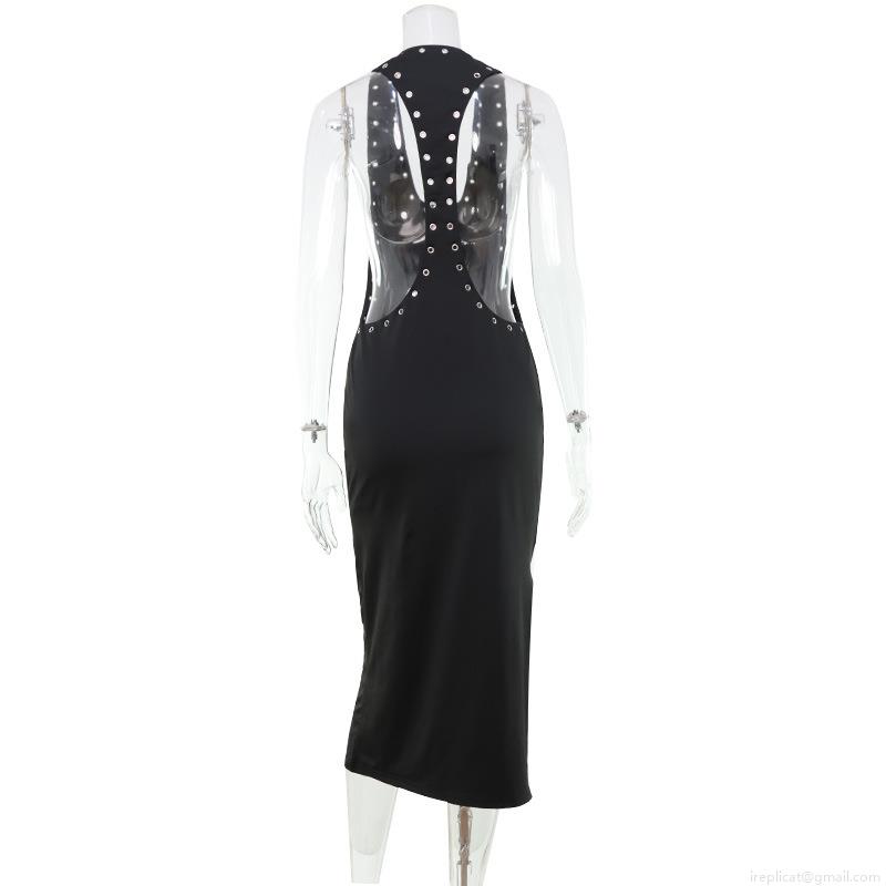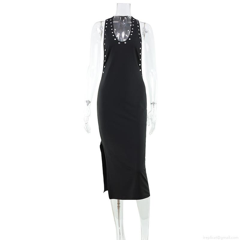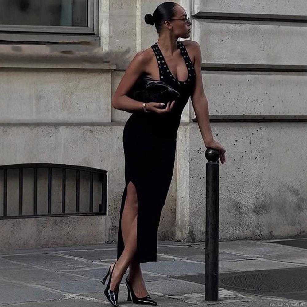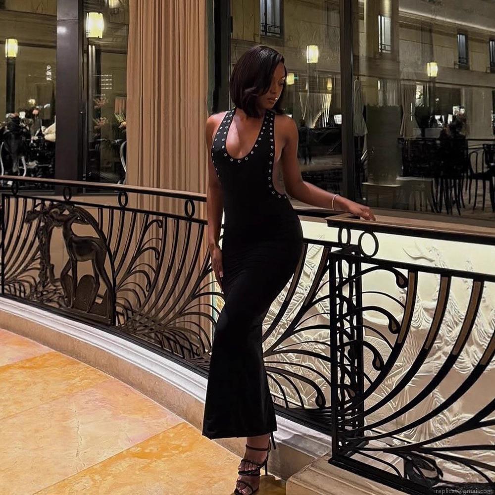 • Sexy Halter Backless Maxi Dress For Women Elastic Polyester Slim Fit U-Neck Dress With Metal Eyelets Grommets Side Slit Club Night Out Party Long Dress