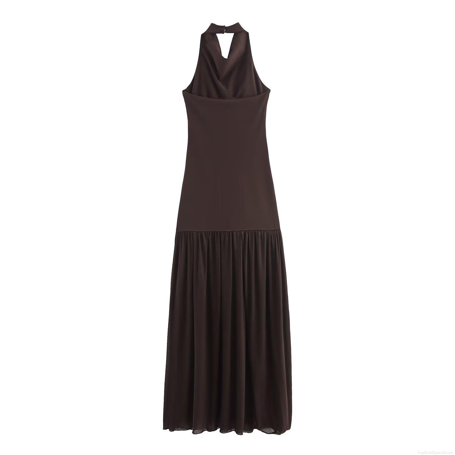 • Sexy Halter Backless Maxi Dress For Women Elegant Mesh Patchwork Slim Fit Sleeveless Coffee Party Evening Long Dress Chic Clubwear Aesthetic