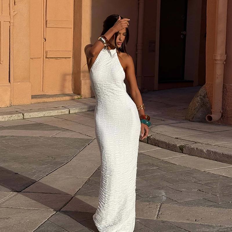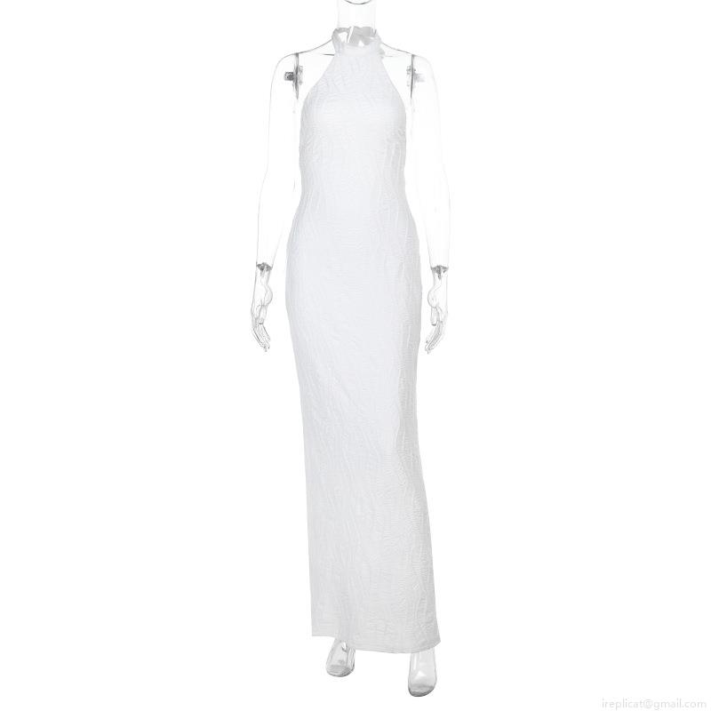 Sexy Halter Backless Maxi Dress For Women Elegant Solid White Textured Fabric Sleeveless Slim Fit Bodycon Long Dress For Summer Vacation Party Gala Evening