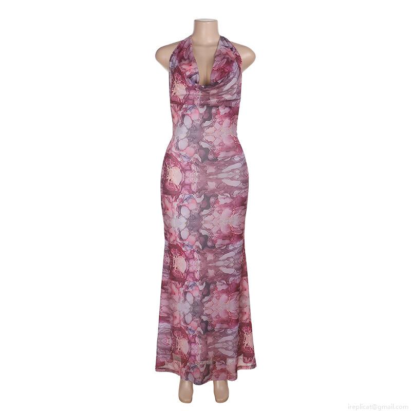 Sexy Halter Deep V Neck Backless Marble Print Maxi Dress Slim Fit Summer Beach Resort Party Long Dress For Women