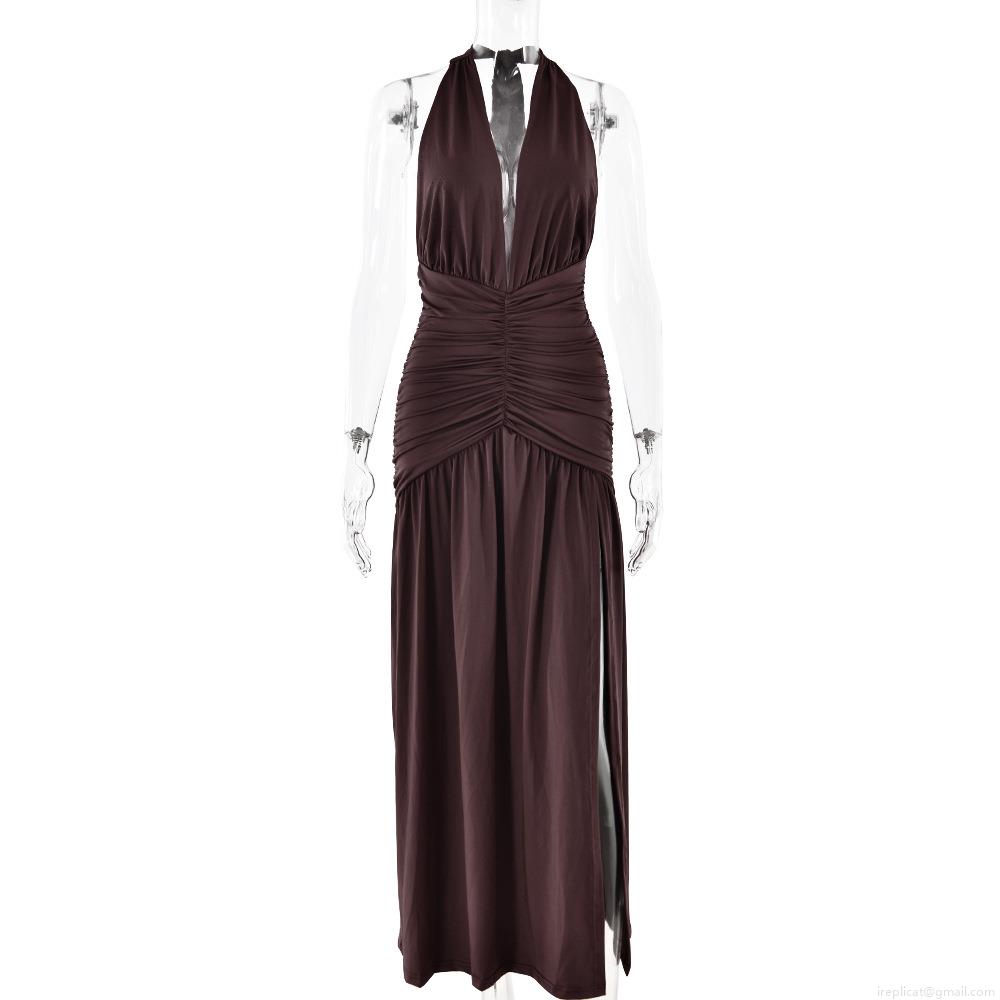 • Sexy Halter Deep V-Neck Backless Maxi Dress For Women Summer High Slit Ruched Bodycon Evening Party Long Dress Milk Silk Clubwear