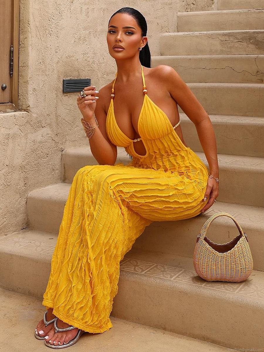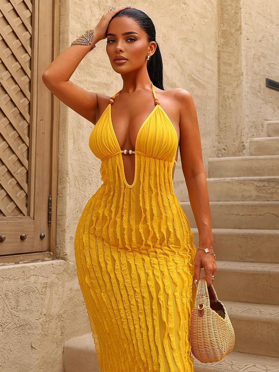 Solid Color, Wood Ear Edge, Pleats, Neckband, Backless, Deep V, Beaded Decorations