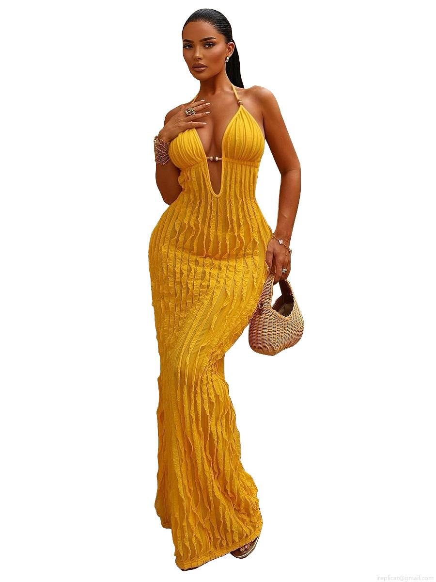 Sexy Halter Deep V-Neck Backless Pleated Maxi Dress Women Summer Vacation Slim Fit Ruched Floor Length Party Club Long Dress with Bead Detail