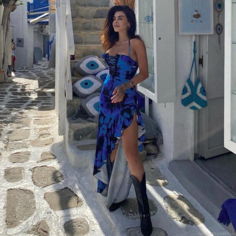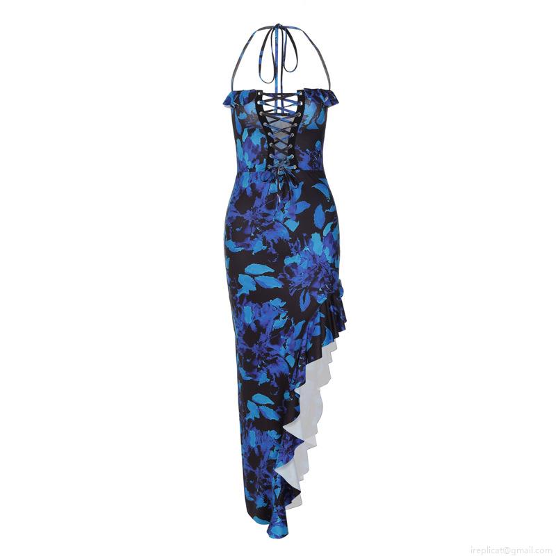 • Sexy Halter Neck Backless Floral Print Maxi Dress For Women Summer Beach Vacation Lace Up High Split Irregular Ruffle Hem Polyester Spandex Bodycon Long Dress