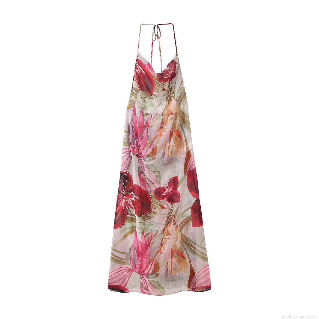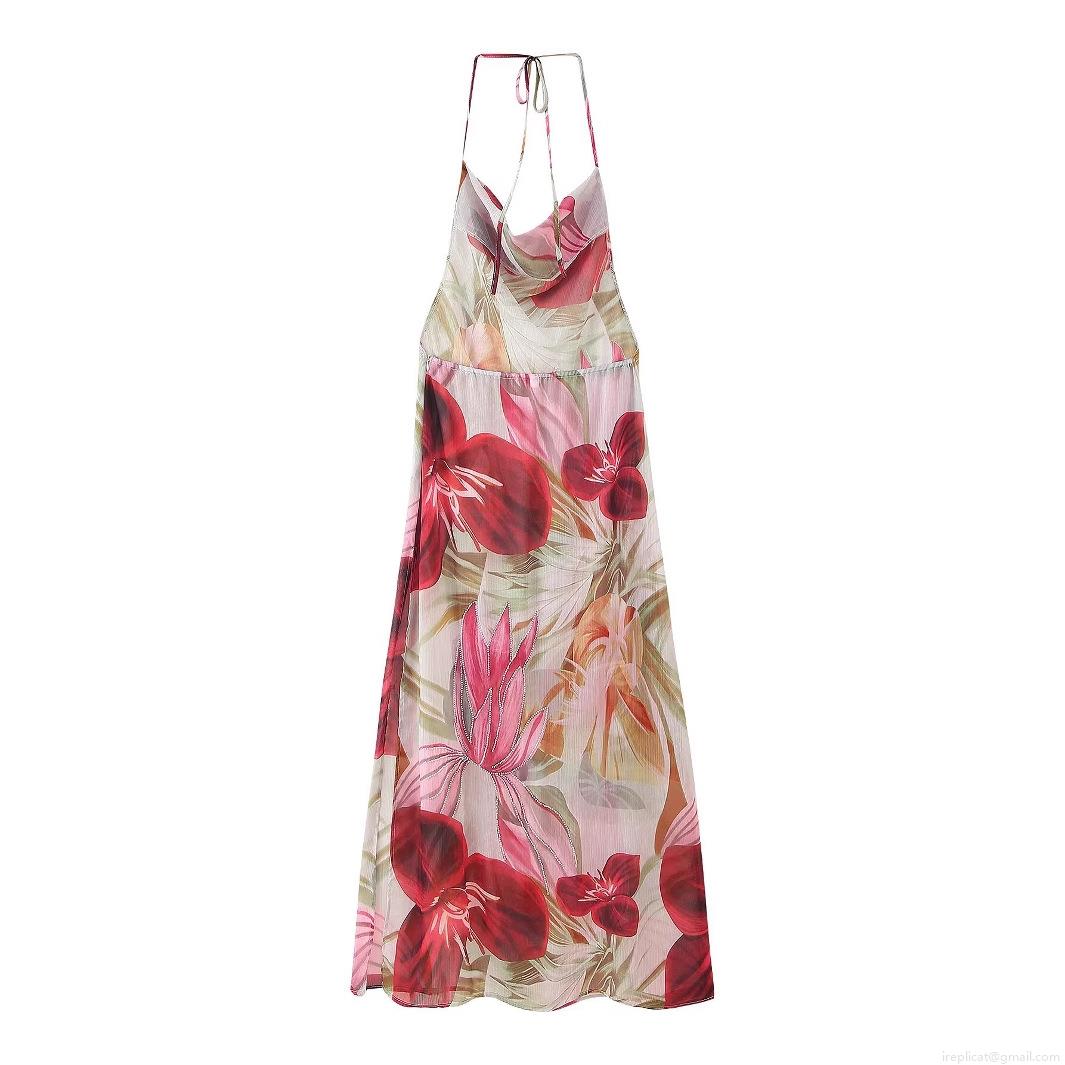 • Sexy Halter Neck Floral Print Maxi Dress For Women Summer Beach Vacation Backless Tie Waist Beaded A-Line Chiffon Dress Elegant Party Long Dresses