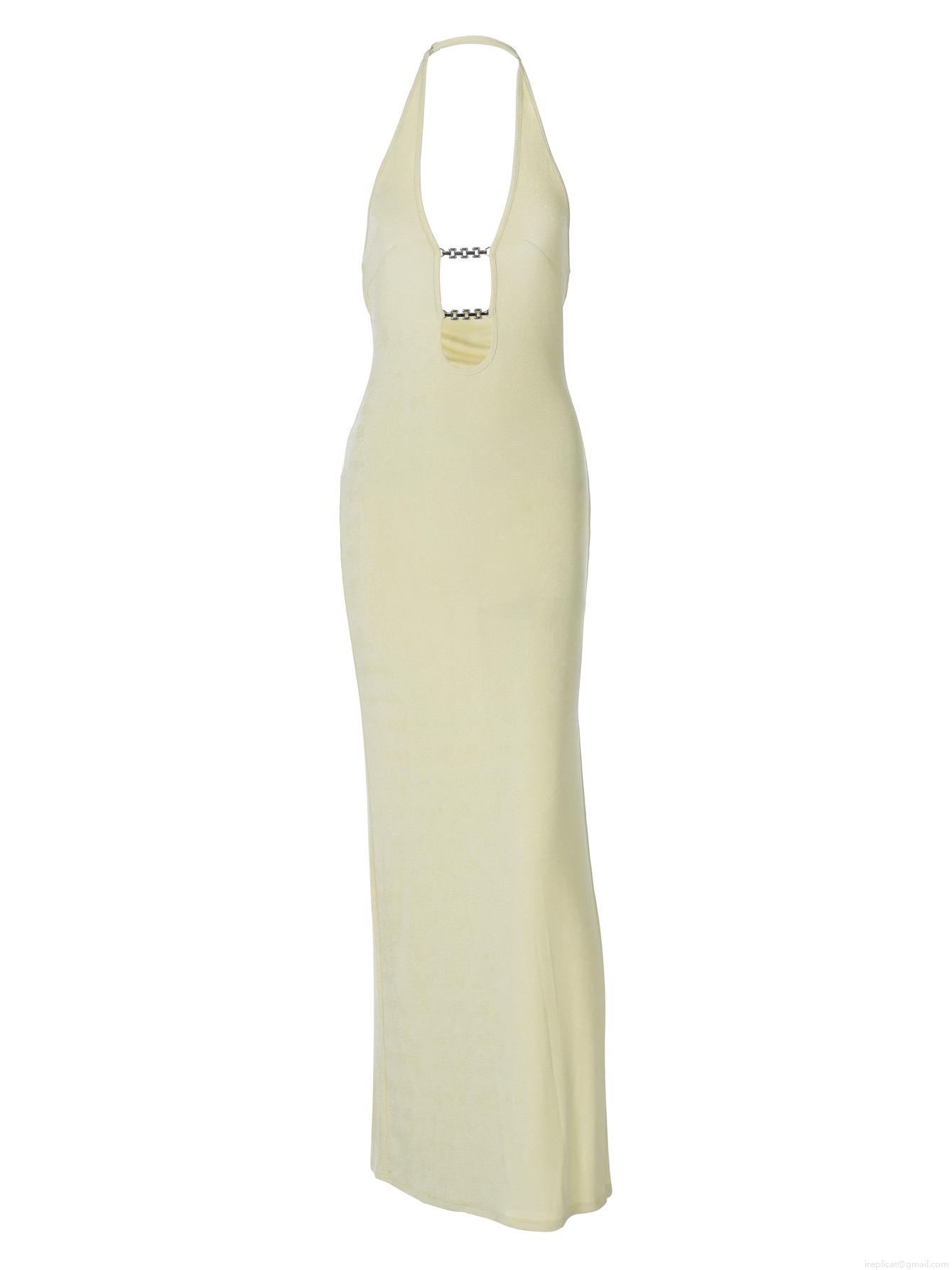 • Sexy Halterneck Maxi Dress Women Summer Polyester Spandex Solid Color Hollow Out With Metal Chain Backless Slim Fit Bodycon Side Split Long Dress For Party Banquet