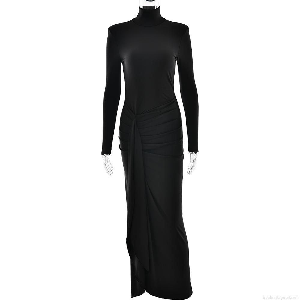 • Sexy High Neck Long Sleeve Maxi Dress Women High Slit Slim Fit Bodycon Milk Silk Ruched Drawstring Evening Party Clubwear Autumn Winter Long Dress