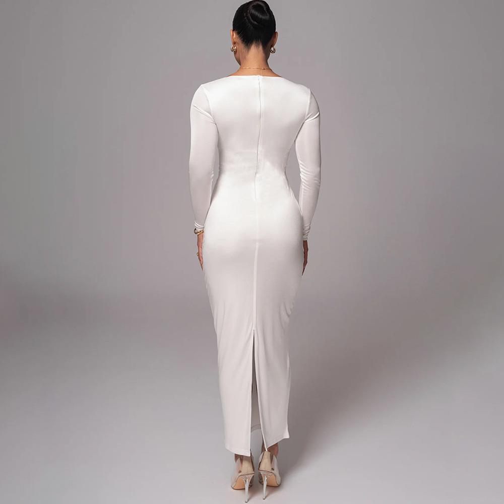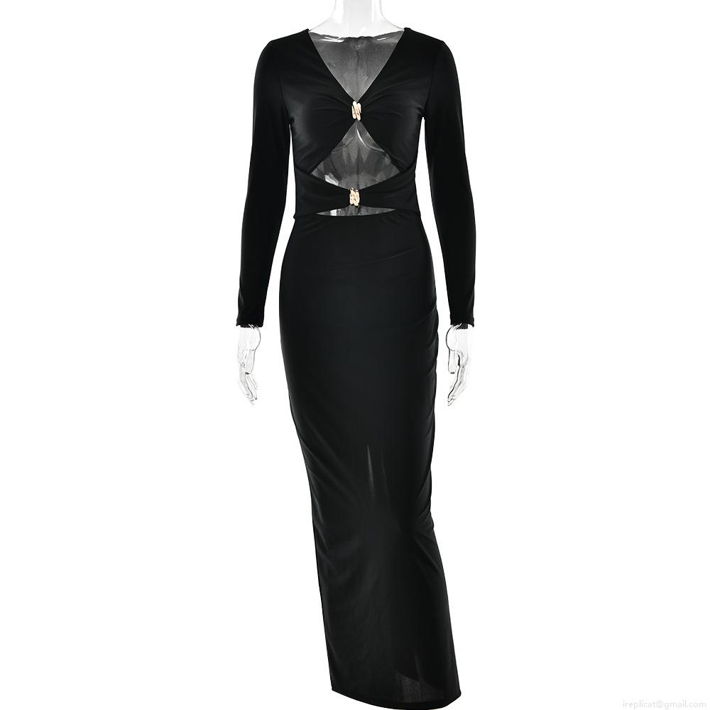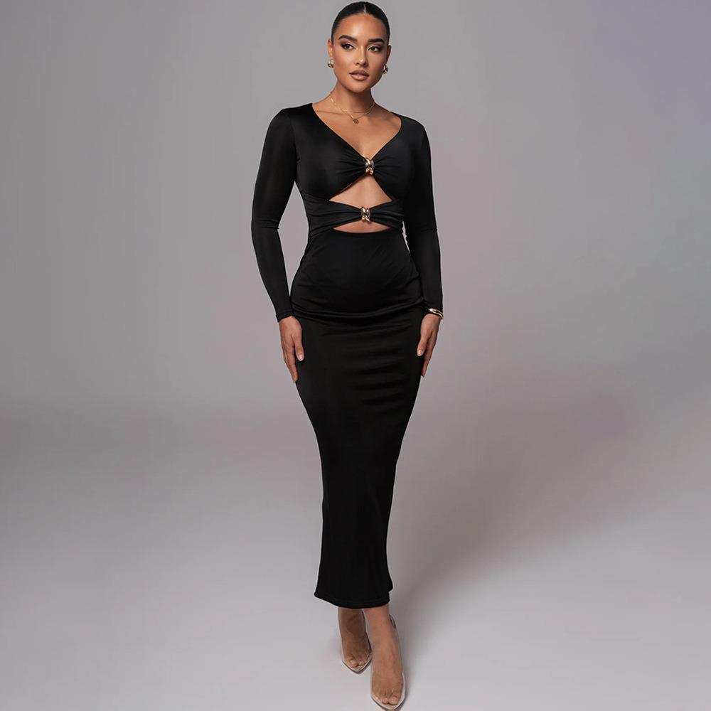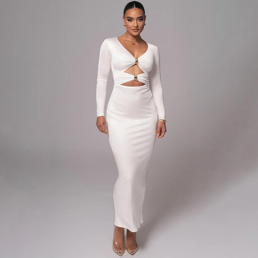 • Sexy Hollow Out Long Sleeve Maxi Dress For Women Satin V Neck Slim Fit Bodycon Evening Party Dress With Metal Rings Slit Long Robe