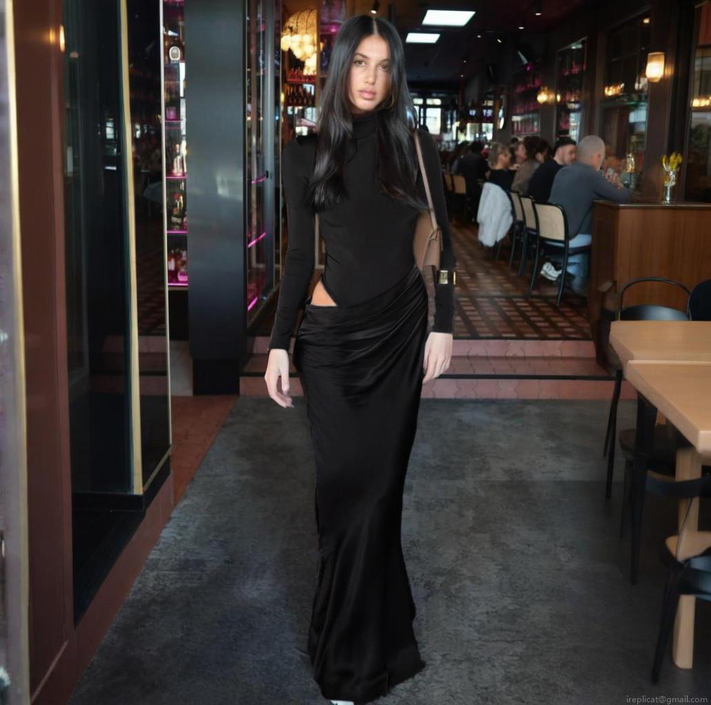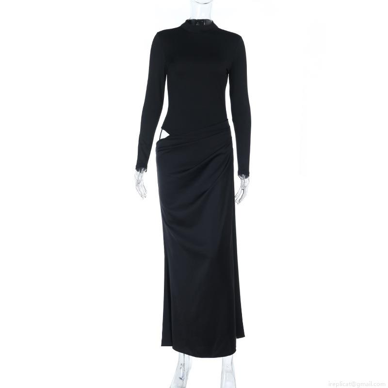 • Sexy Hollow Out Maxi Dress For Women Mock Neck Long Sleeve High Waist Pleated Spliced Black Long Dress Party Club Night Out Evening Streetwear Fashion Slim Fit