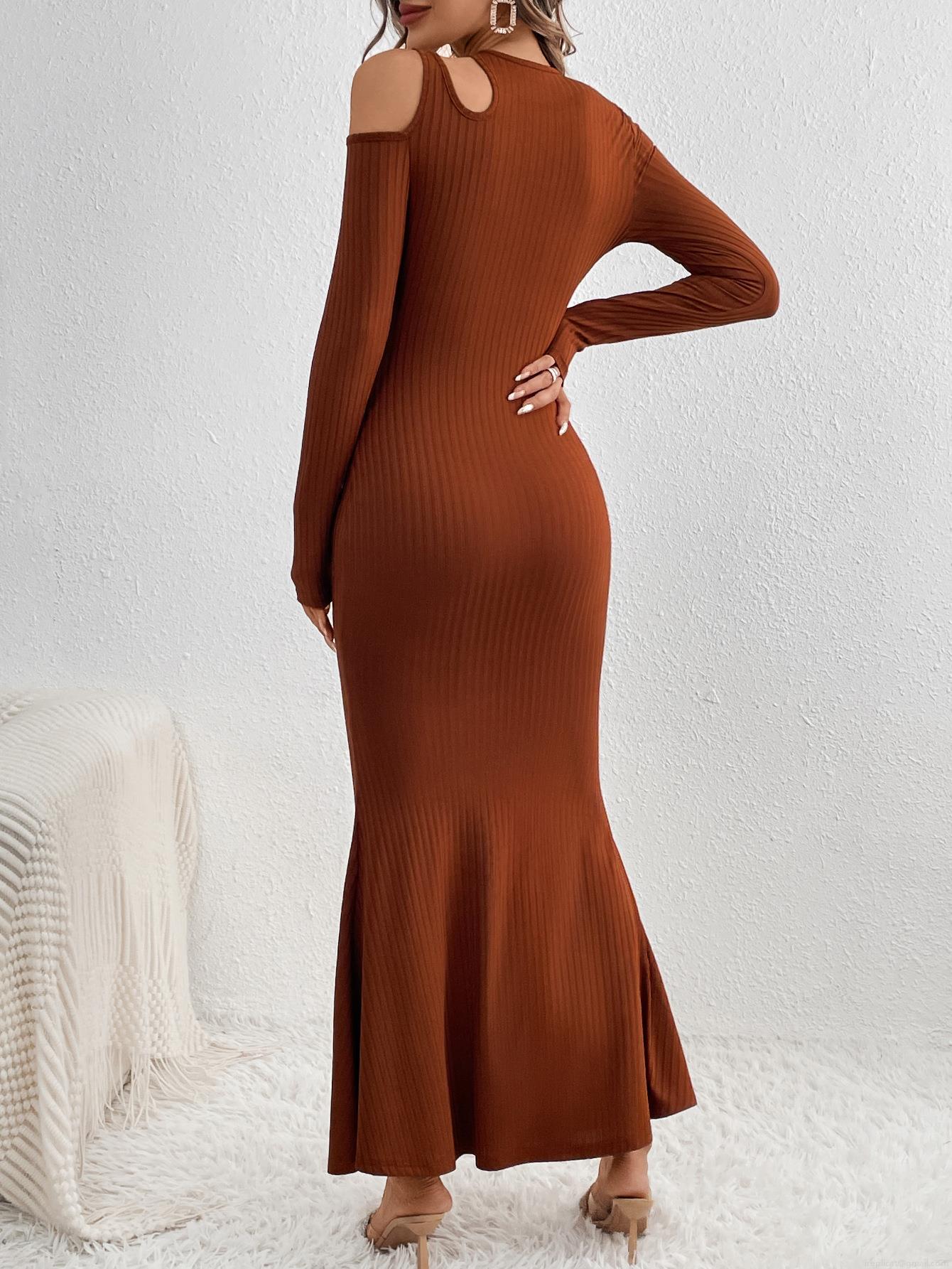 Sexy Hollow Out One Shoulder Long Sleeve Maxi Dress For Women Solid Caramel Brown Ribbed Knitted Slim Fit Hip Wrap Fishtail Evening Party Dress