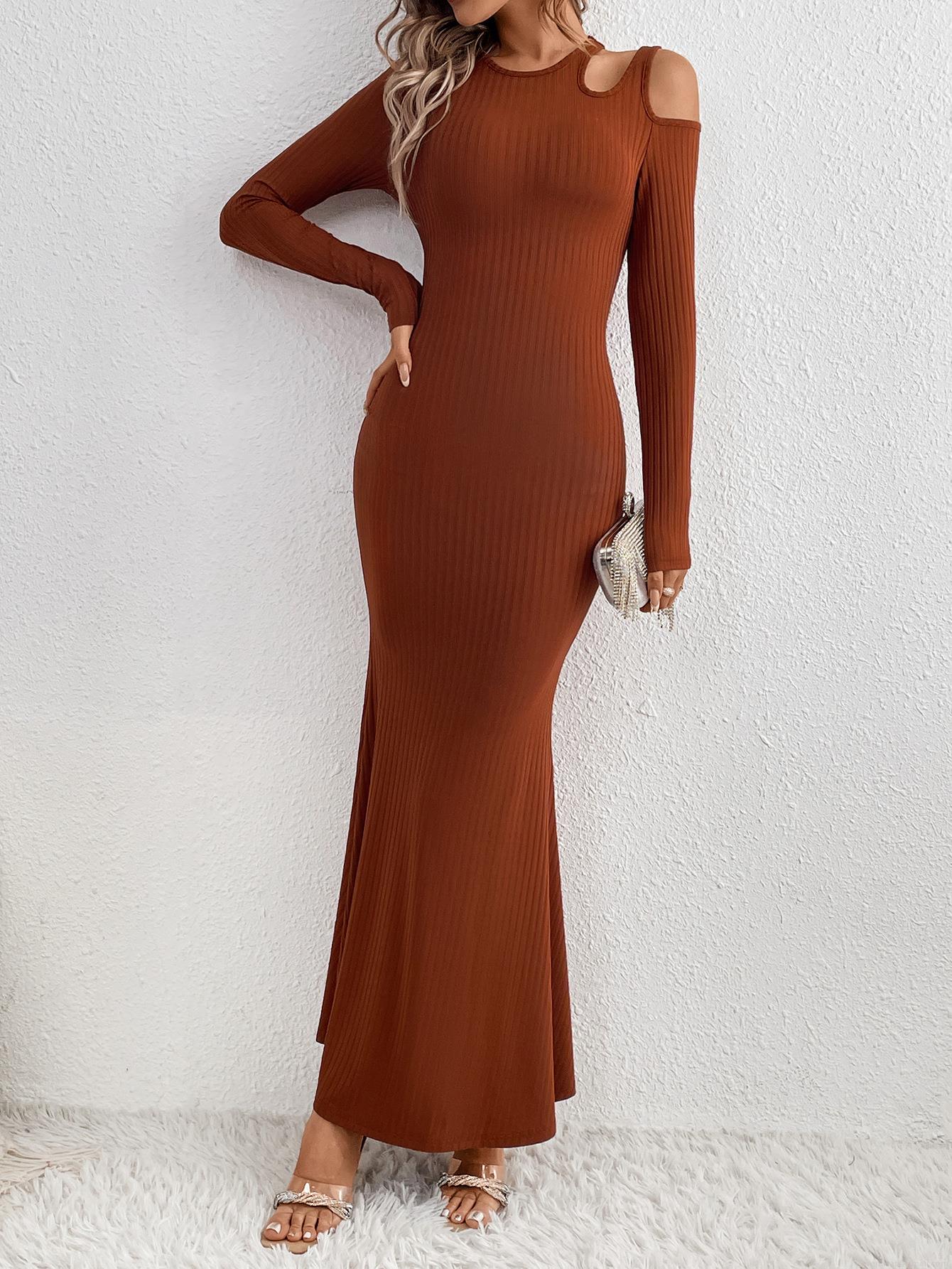 • Sexy Hollow Out One Shoulder Long Sleeve Maxi Dress For Women Solid Caramel Brown Ribbed Knitted Slim Fit Hip Wrap Fishtail Evening Party Dress