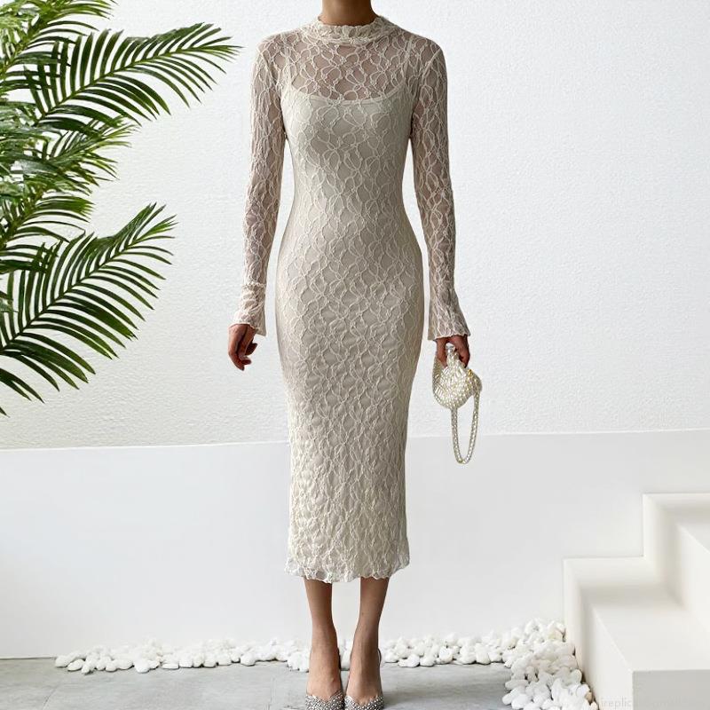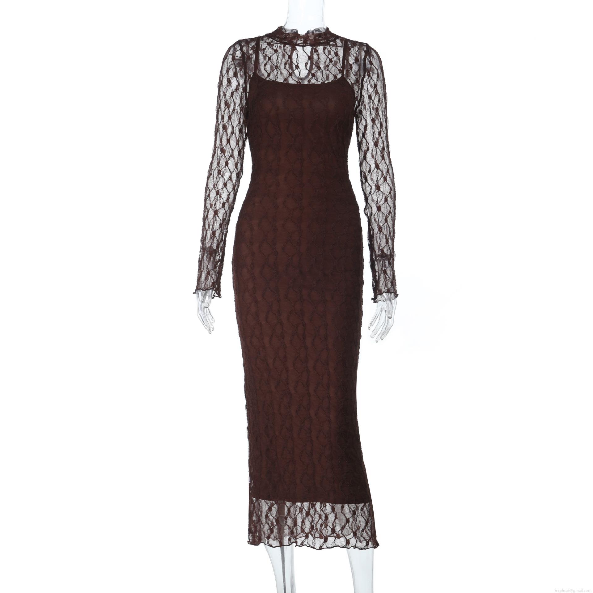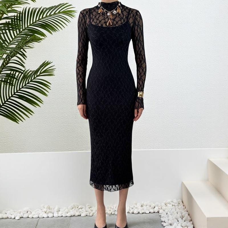 Sexy Lace Maxi Dress Women Two Piece Set Mesh Hollow Out Mock Neck Long Sleeve Bodycon Dress With Slip Lining Party Clubwear Evening Gown