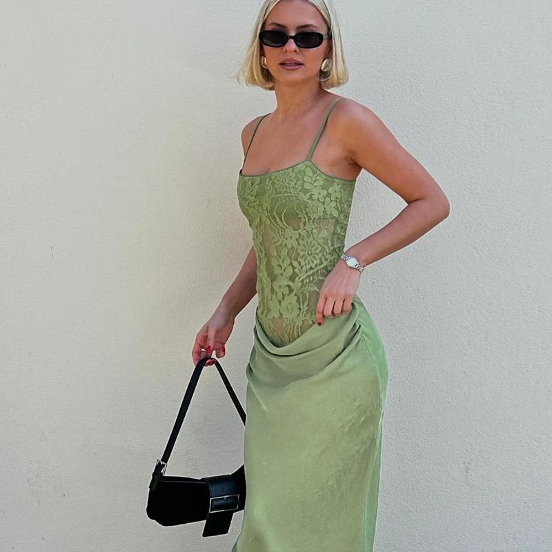 Sexy Lace Satin Patchwork Maxi Dress Spaghetti Strap Slim Fit Ruched Cami Dress for Women Summer Party Date Sage Green Square Neck Sleeveless Dress