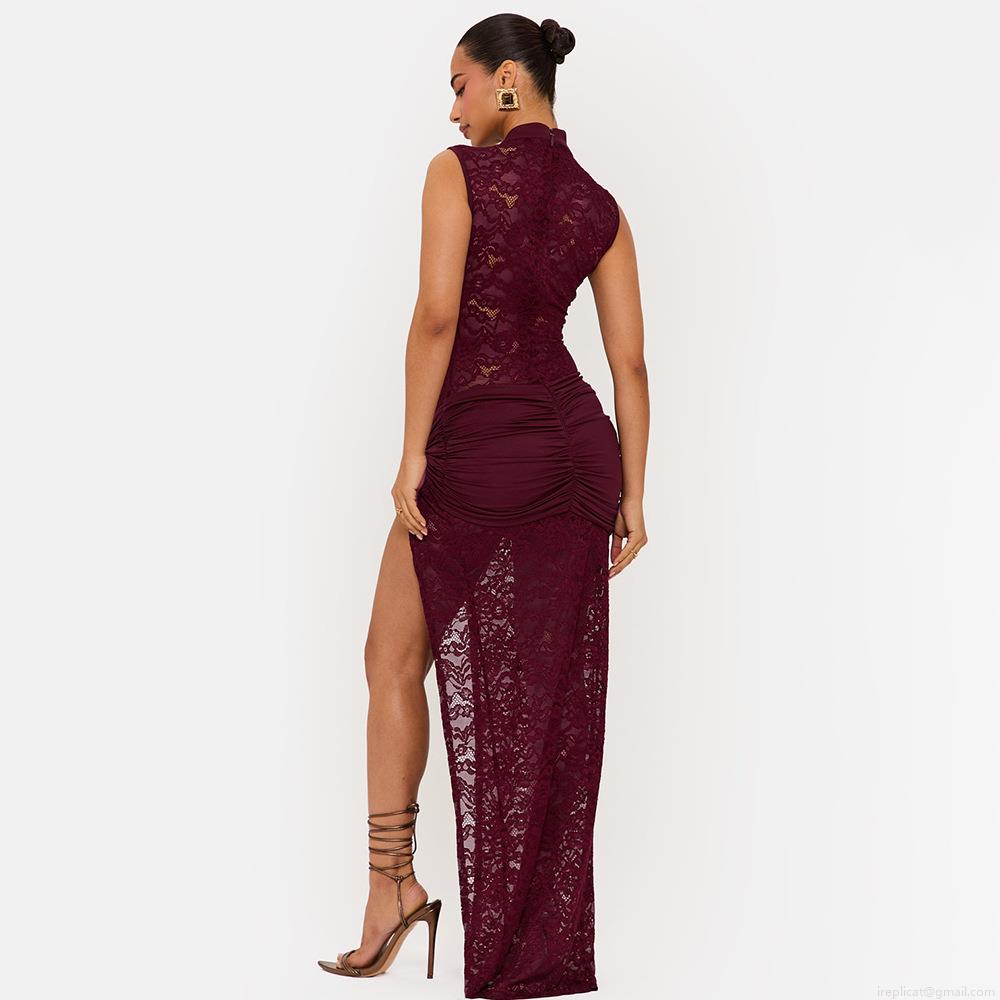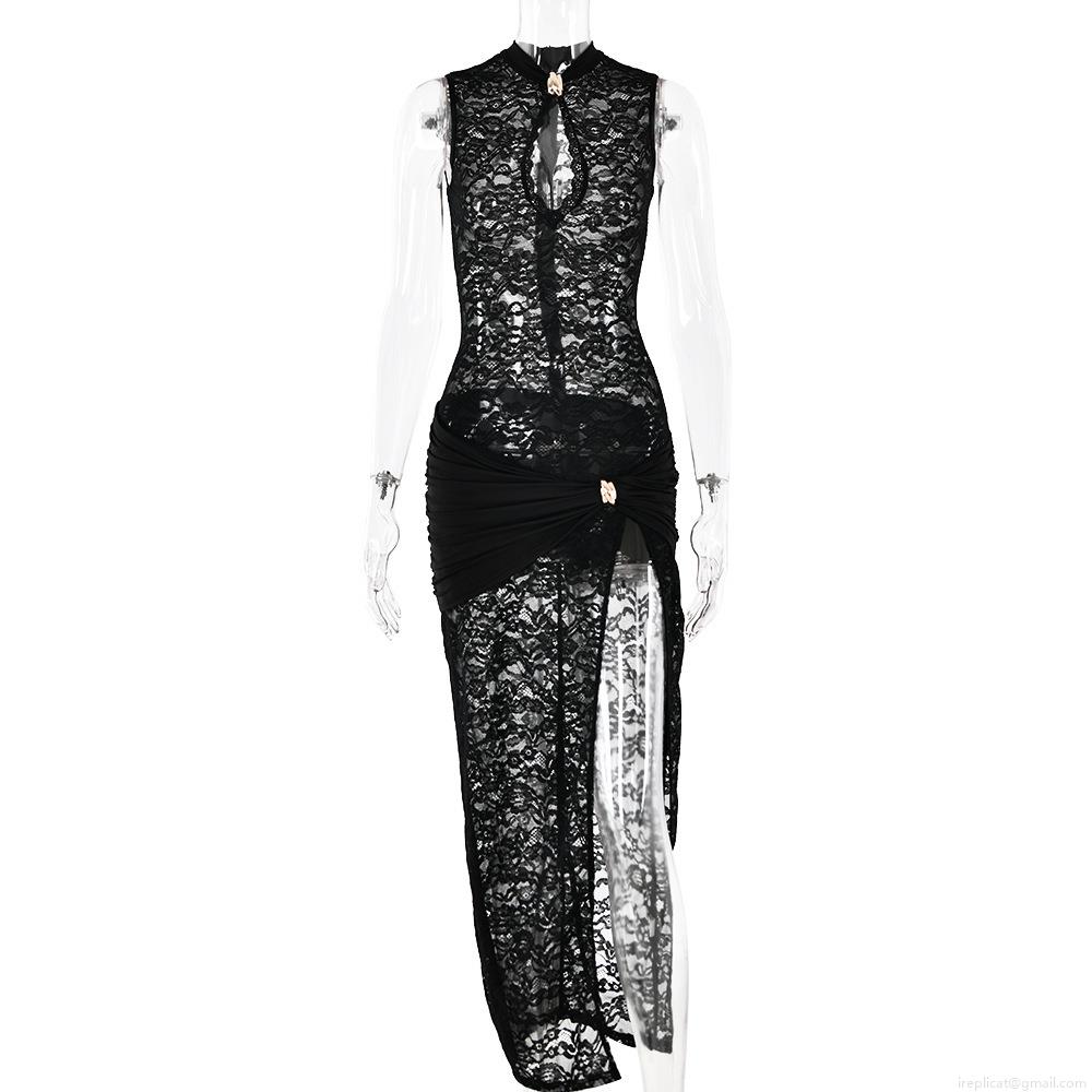 Sexy Lace See-Through Sleeveless Maxi Dress For Women Elegant High Slit Backless Patchwork Bodycon Long Evening Party Club Dress