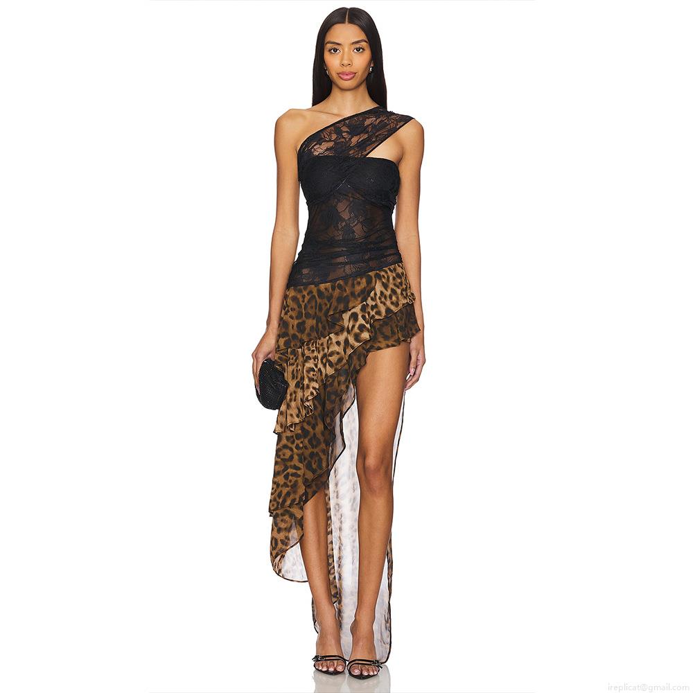 • Sexy Leopard Print One Shoulder Maxi Dress For Women Lace Patchwork Chiffon Asymmetric Ruffle Hem Backless High Waist Slim Fit Party Clubwear Dress