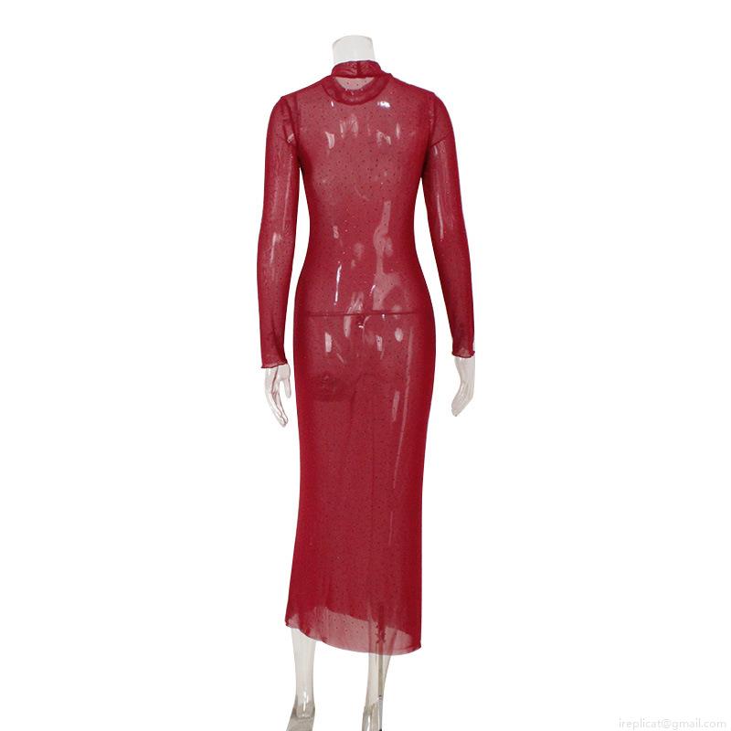 • Sexy Mesh See-Through Rhinestone Maxi Dress Women Elegant Mock Neck Long Sleeve Bodycon Clubwear Party Evening Long Cover-Up Dress