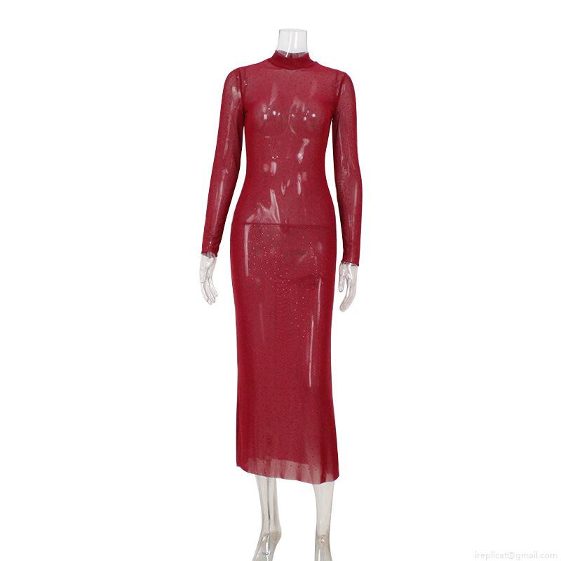 Sexy Mesh See-Through Rhinestone Maxi Dress Women Elegant Mock Neck Long Sleeve Bodycon Clubwear Party Evening Long Cover-Up Dress