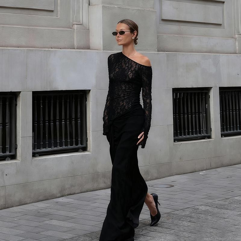 Solid Color, Splice, Lace, Hollow Out, Off-shoulder, Floral Lace, Asymmetrical Collar