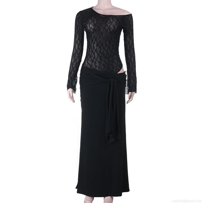 Sexy Off Shoulder Lace Patchwork Maxi Dress Women Long Sleeve Bodycon Elegant Evening Party Club Dress Solid Color Hollow Out Long Gown