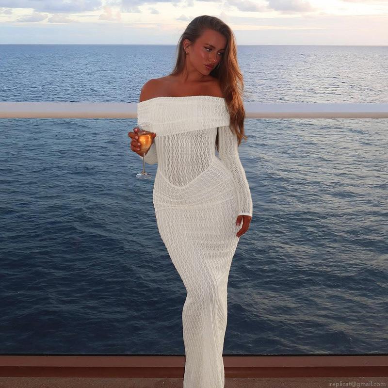 • Sexy Off-Shoulder Maxi Dress For Women Textured Polyester Spandex Long Sleeve Slim Fit Hollow Out Crochet Evening Gown Party Vacation Dress