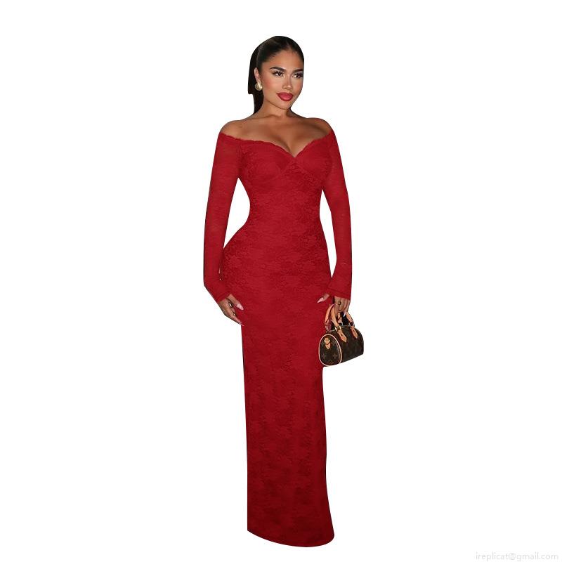 • Sexy Off-the-Shoulder Lace Bodycon Maxi Dress For Women Elegant Long Sleeve Red Formal Party Evening Gown Made Of Polyester And Spandex