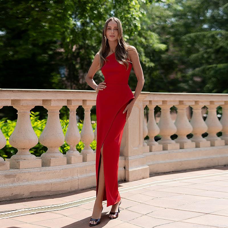 • Sexy One Shoulder High Split Flounce Waist Evening Dress Polyester Spandex Knitted Slim Fit Maxi Dress For Women Banquet Party Elegant Dress