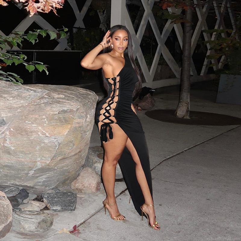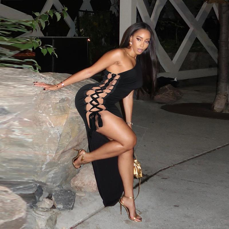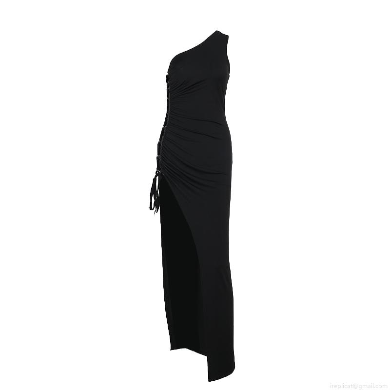 • Sexy One Shoulder Maxi Dress Ruched Side Lace-up High Slit Bodycon Long Dress Polyester Spandex Party Clubwear Evening Gown for Women