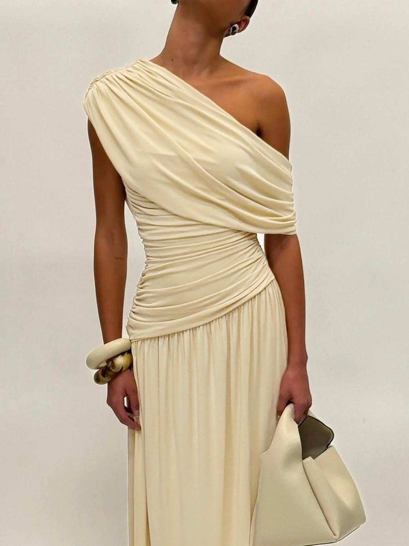 Solid Color, Irregular, One Shoulder, Pleats, Gathering, Asymmetrical Collar