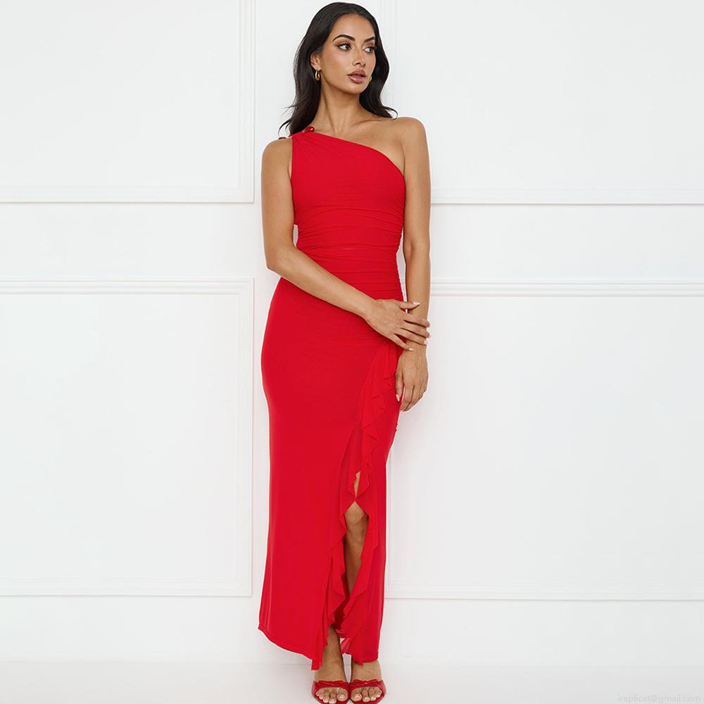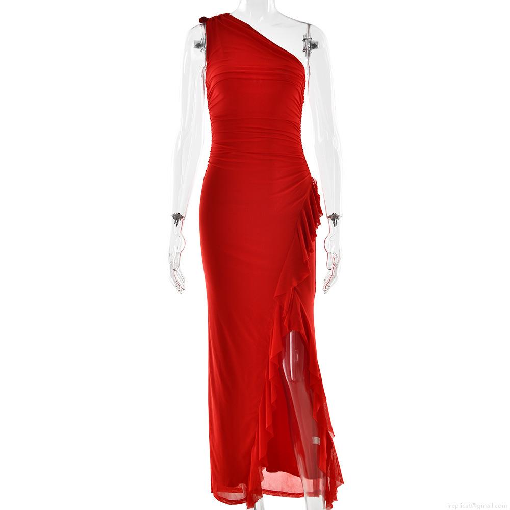 • Sexy One Shoulder Ruched Maxi Dress For Women High Slit Ruffle Bodycon Long Dress Summer Party Club Evening Gown Milk Silk Polyester Clothing