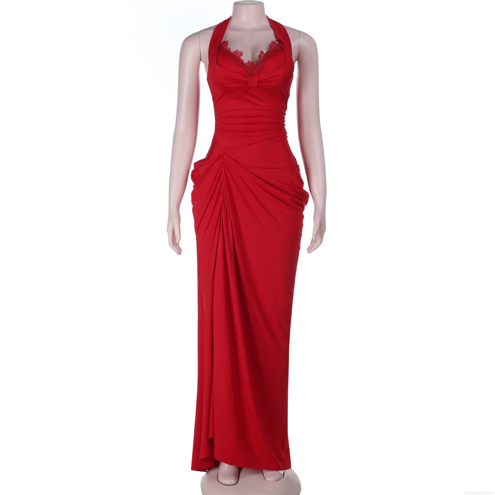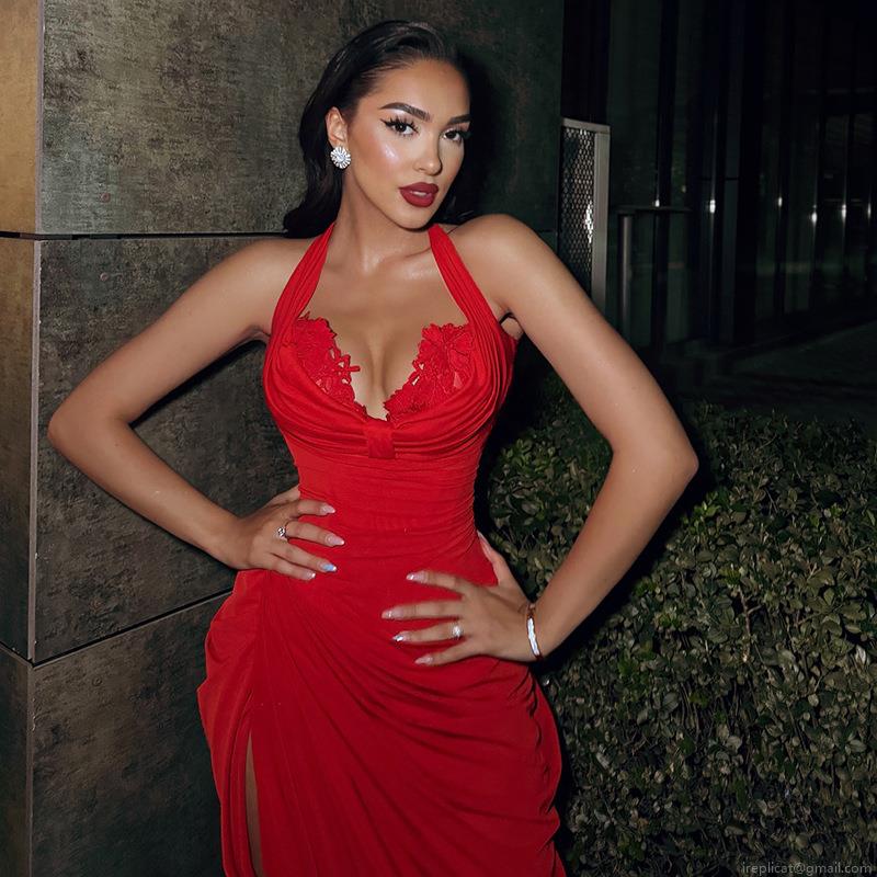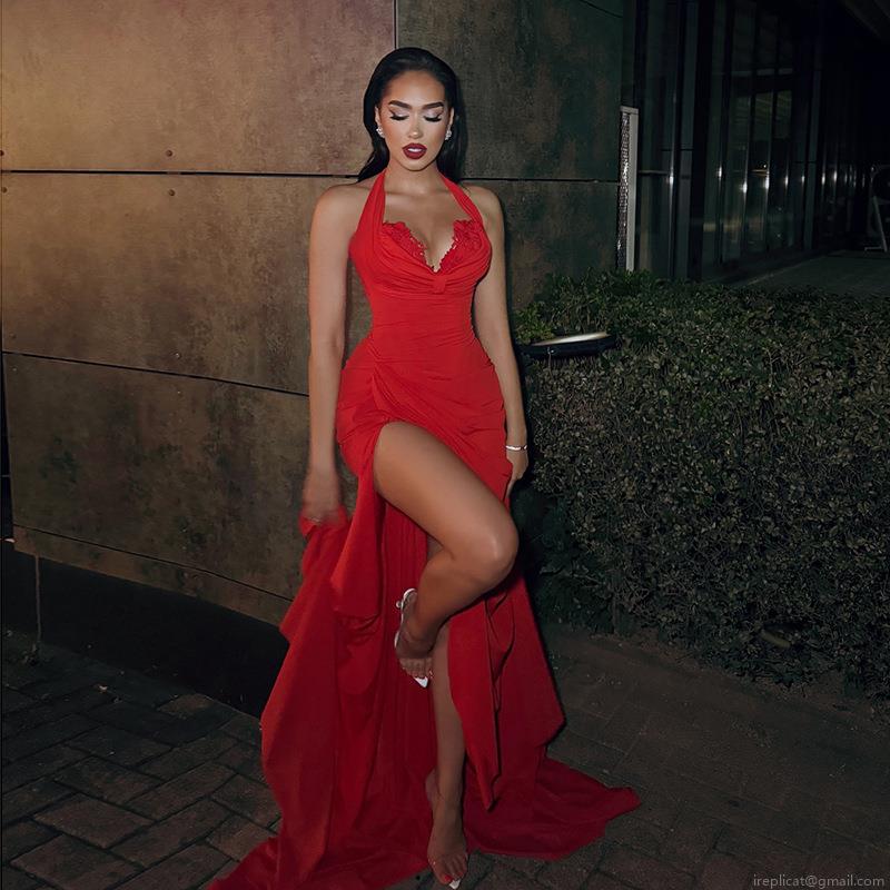 • Sexy Red Halter Neck Backless Maxi Dress With Lace Trim High Slit Pleated Stretchy Polyester Long Evening Party Dresses For Women